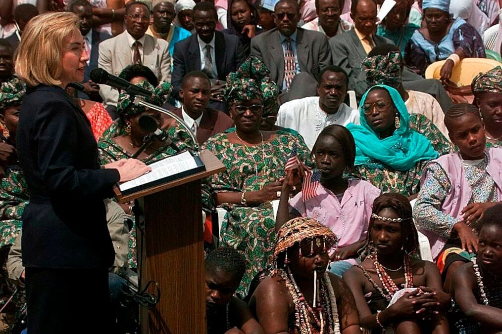 Then-first lady Hillary Clinton speaks to students and parents of the Martin Luther King Jr. School, an all girls school, on March 17, 1997, in Dakar Senegal.