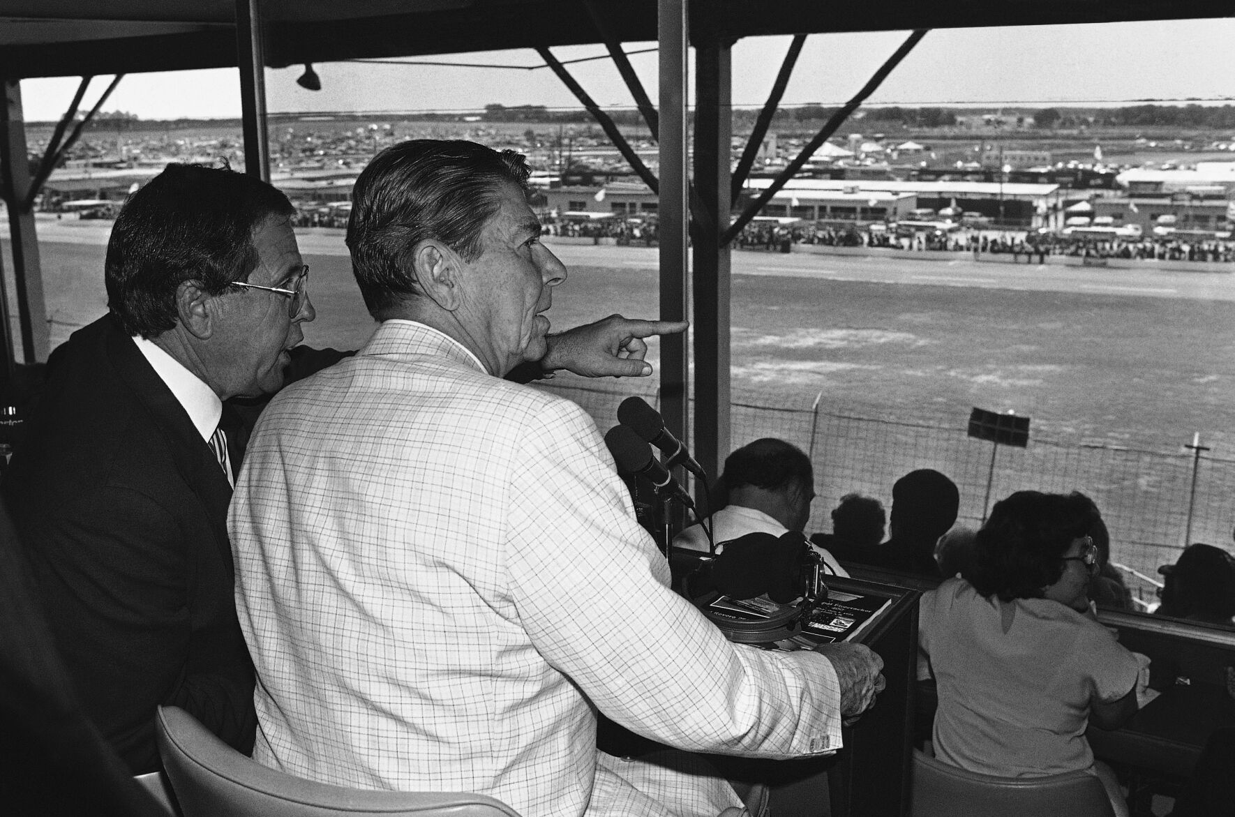 President Ronald Reagan, front right, sits with William France Jr., president of NASCAR and part owner of the Daytona Speedway, and watches the running of the Firecracker 400 stock car race July 4, 1984, in Daytona Beach, Fla.