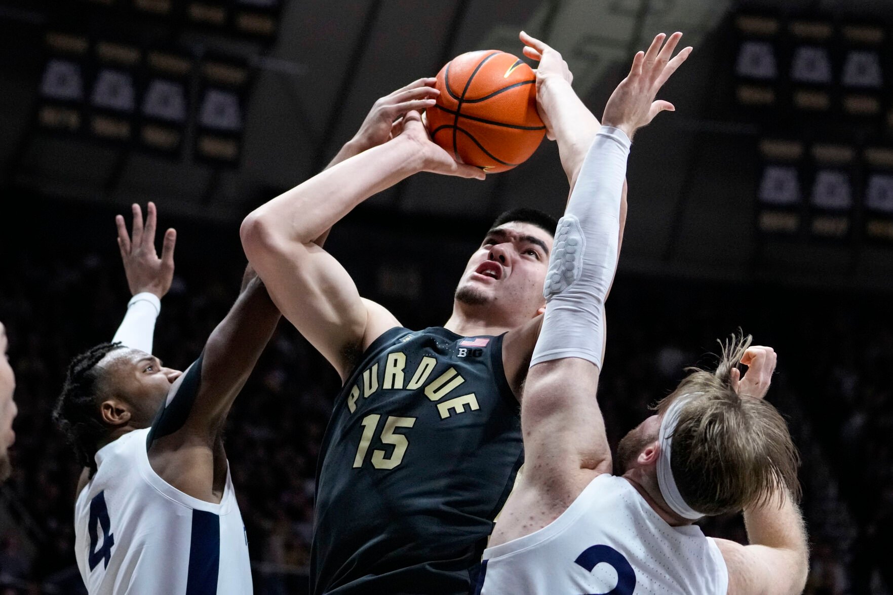 Purdue center Zach Edey is fouled as he shoots between Penn State forward Caleb Dorsey (4) and forward Michael Henn (24) during the second half of Wednesday's game in West Lafayette, Ind.