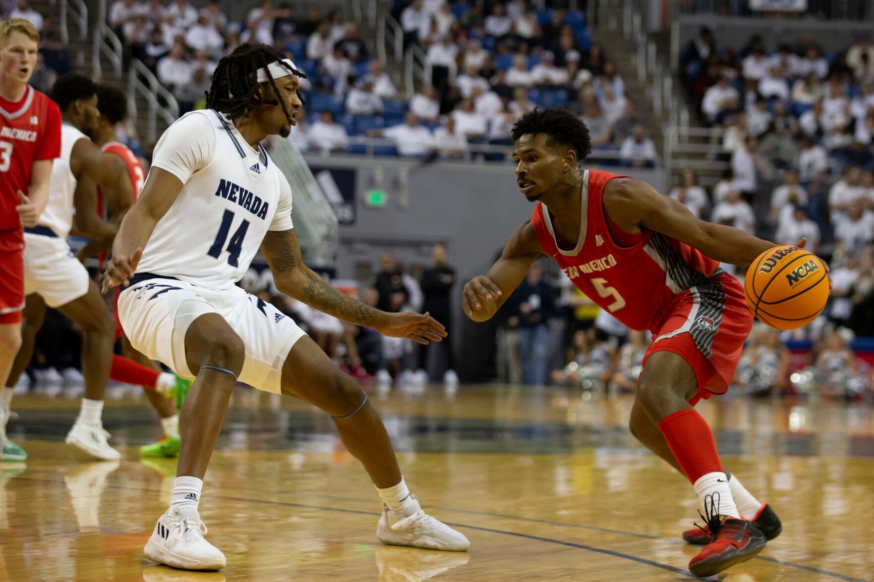New Mexico guard Jamal Mashburn Jr., right, drives on Nevada forward Tre Coleman during the first half of Monday's game in Reno, Nev.