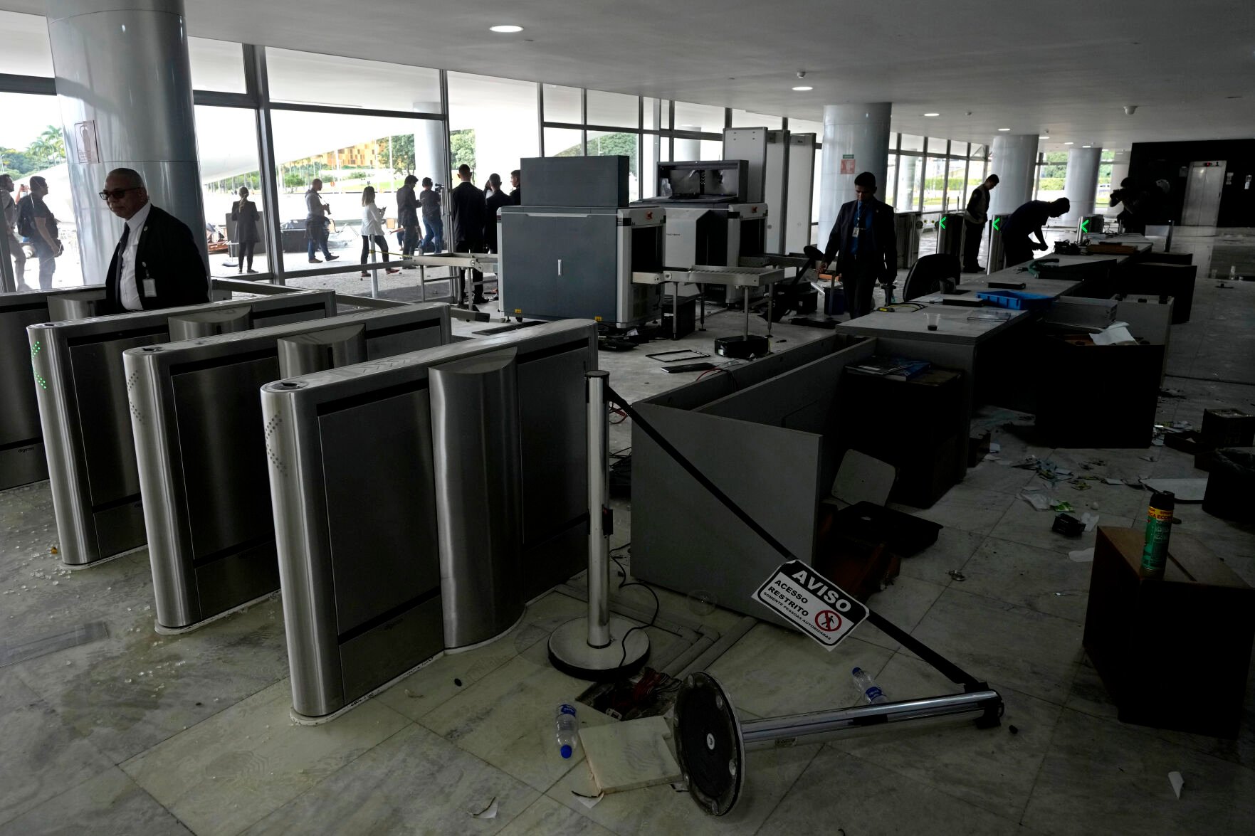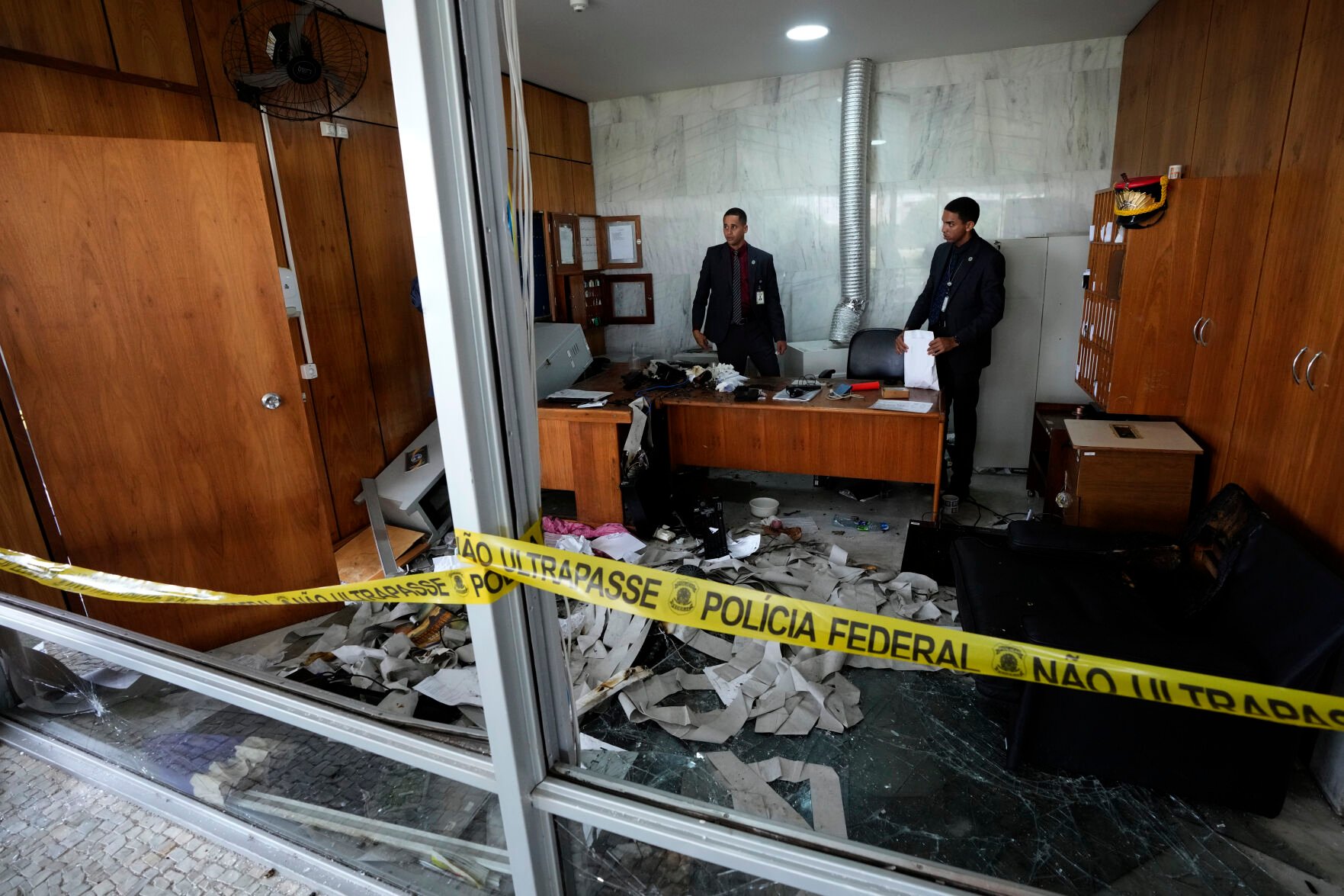 Agents inspect a security room that was trashed inside Planalto Palace, the office of the president, on Monday — the day after it was stormed by supporters of Brazil's former President Jair Bolsonaro — in Brasilia, Brazil.