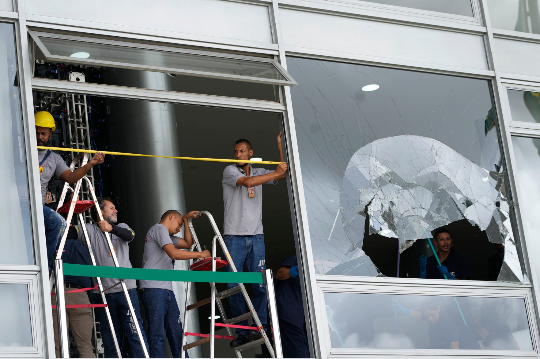 Workers measure the windows of Planalto Palace, the office of the president, on Monday — the day after it was stormed by supporters of Brazil's former President Jair Bolsonaro — in Brasilia, Brazil.