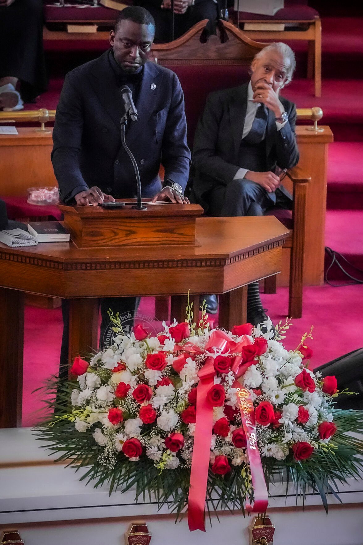 The Rev. Al Sharpton, right, listens as Dr. Yusef Salaam speaks during the funeral service for Jordan Neely, the victim of a deathly chokehold on a subway, at Harlem's Mount Neboh Baptist Church on May 19 in New York.