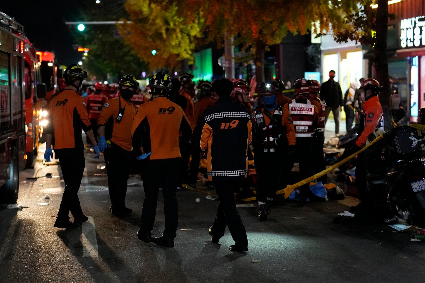 Rescue workers and firefighters try to rescue people at the street near the scene in Seoul, South Korea, early Sunday, Oct. 30, 2022. South Korean officials said around 50 people were in cardiac arrest and a number feared dead after being crushed by a large crowd pushing forward on a narrow street during Halloween festivities in the capital Seoul. (AP Photo/Lee Jin-man)