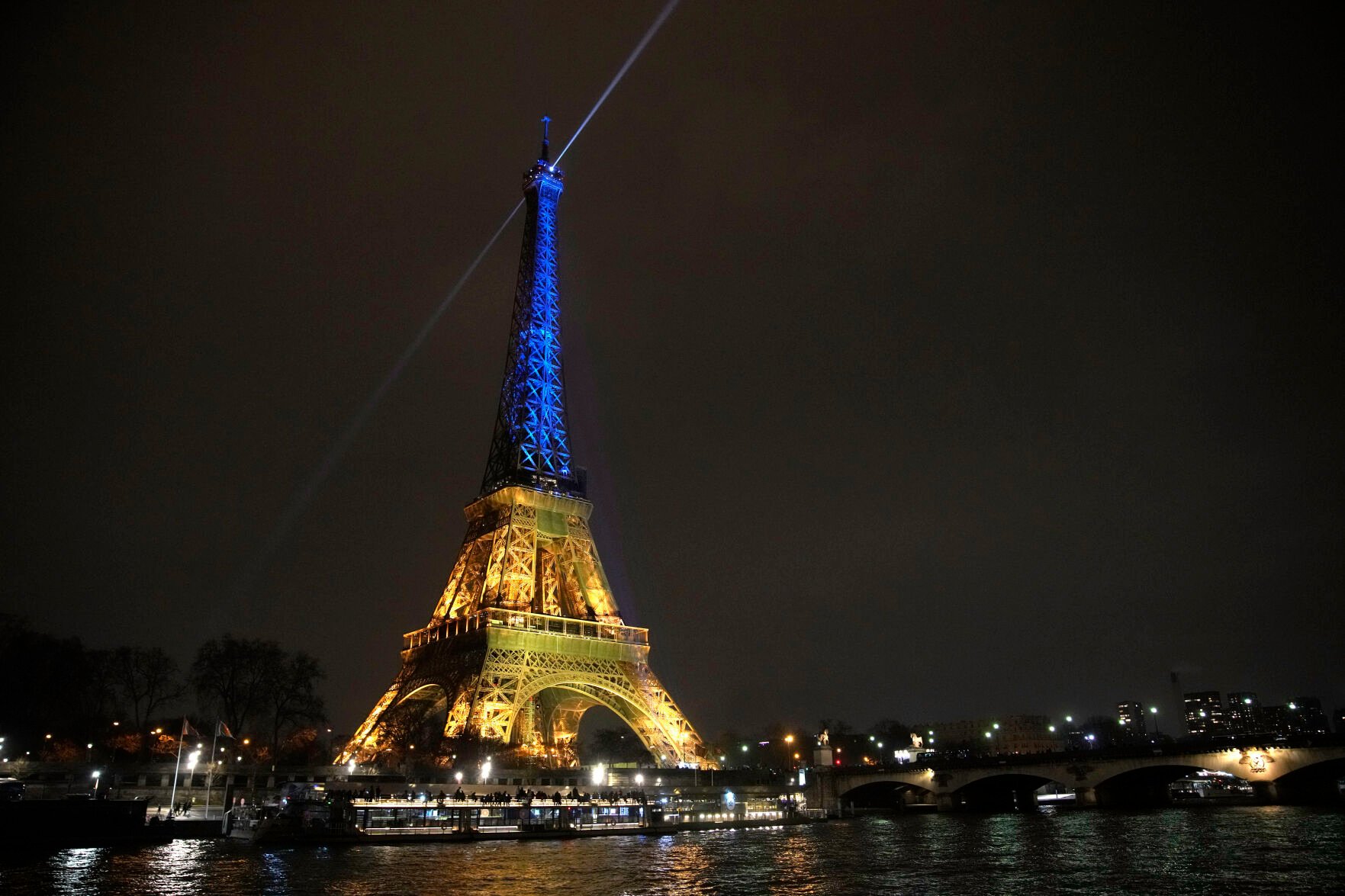The Eiffel Tower is illuminated with the colors of Ukraine to mark the one-year anniversary of Russia's invasion of the country, in Paris, Thursday, Jan. 23, 2023. (AP Photo/Christophe Ena)