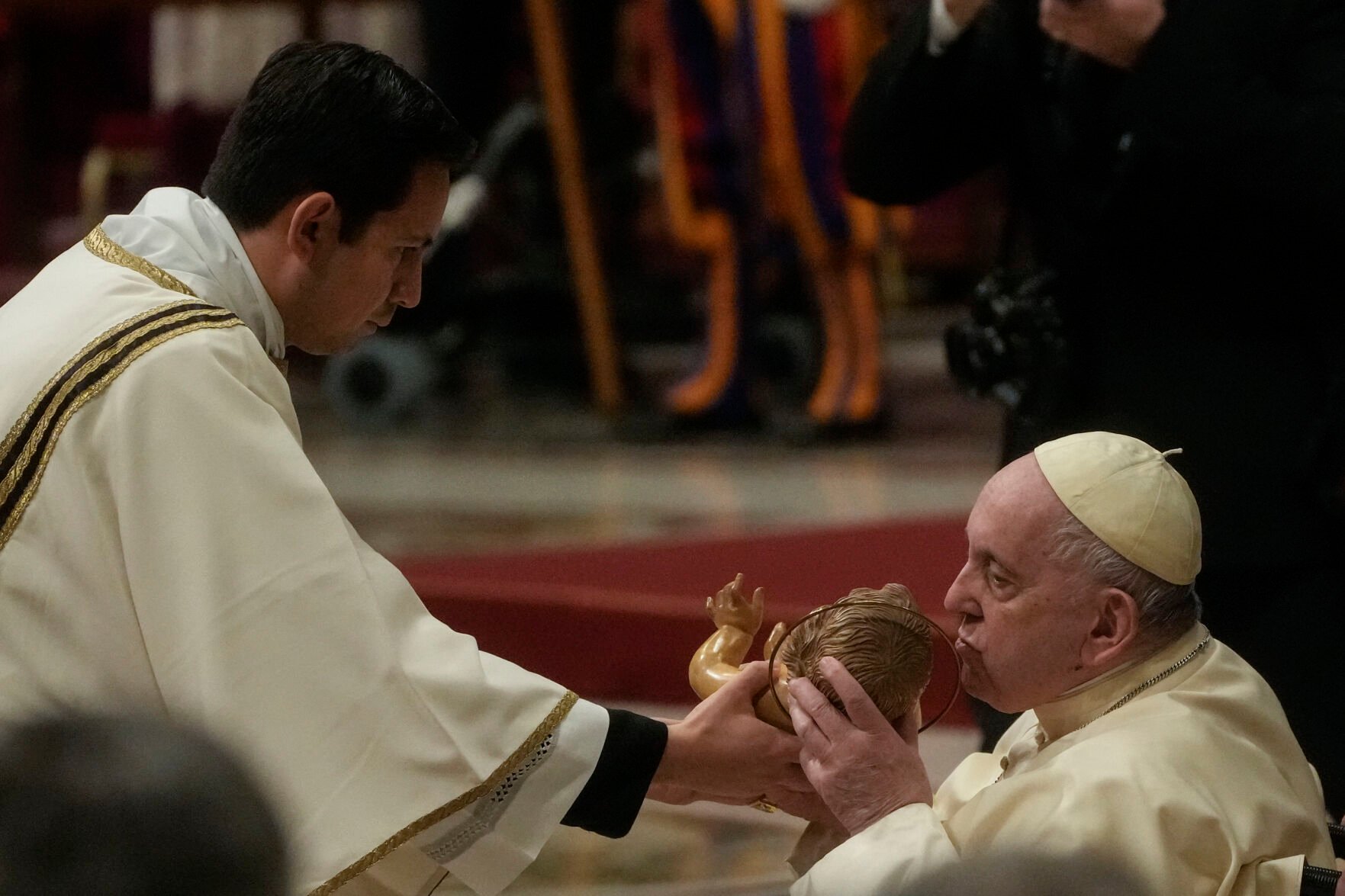 Pope Francis kisses a statue of Baby Jesus on Saturday as he presides over Christmas Eve Mass at St. Peter's Basilica at the Vatican.