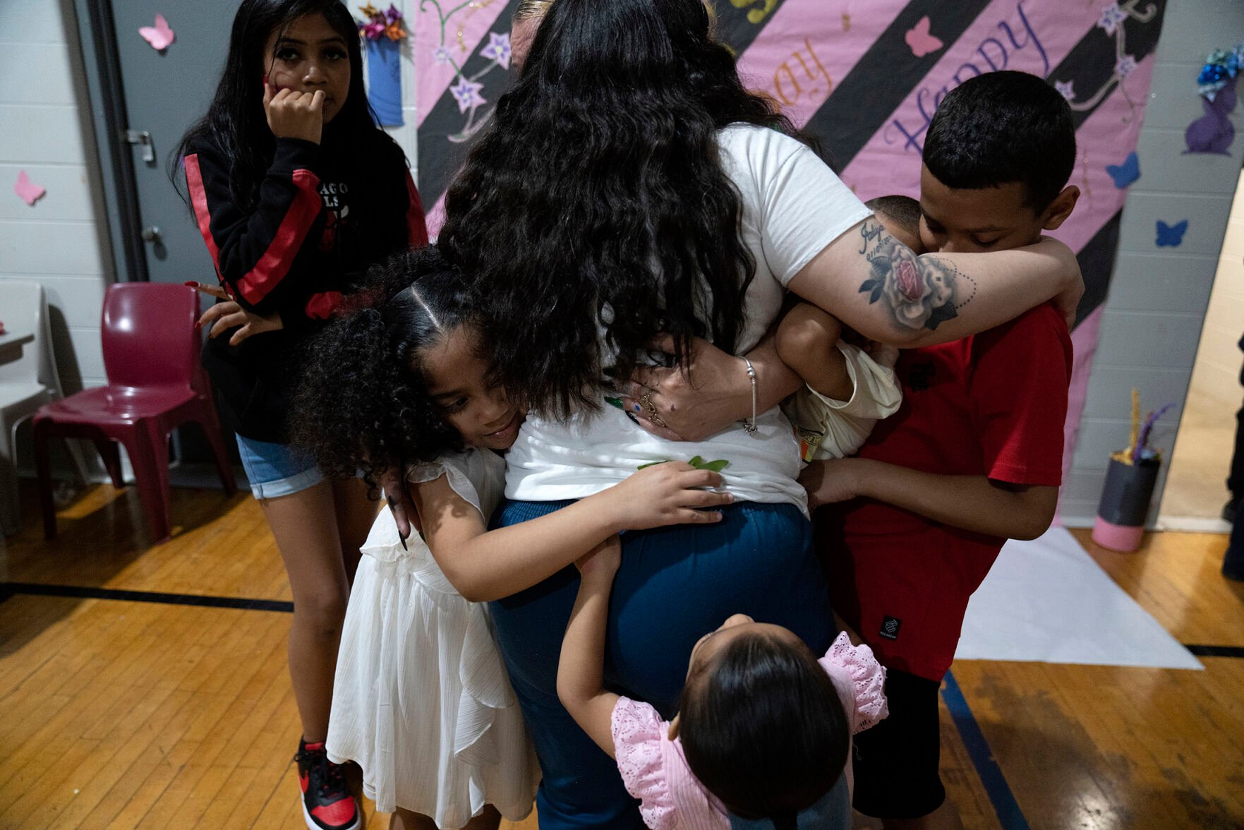 Crystal Martinez, center, is embraced by her five children, clockwise from top left, Nevaeh Martinez, 13, Jayceon Santiago, 5, Reggie Johnson, 10, Jaliyah Santiago, 4, and Myla Martinez, 6, on May 20 as they prepare to leave her at Logan Correctional Center in Lincoln, Illinois.