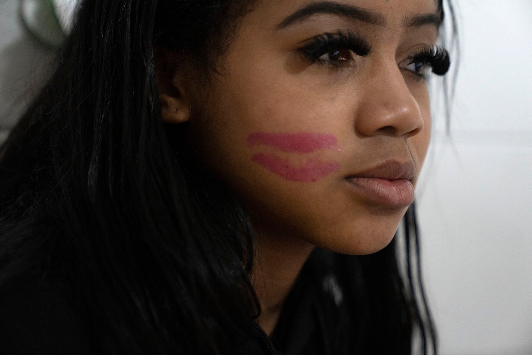 Nevaeh Martinez, 13, wears a lipstick kiss from her mother Crystal Martinez on May 20 as she and her four younger siblings spend time her with her at Logan Correctional Center in Lincoln, Illinois.