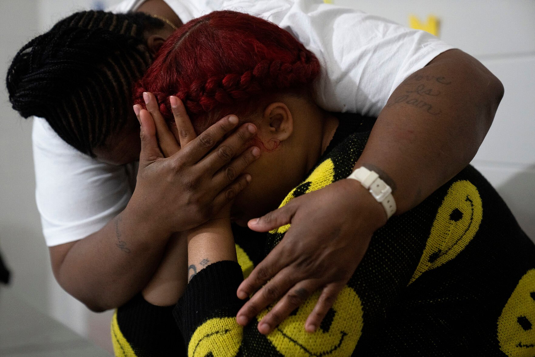 Latonya Dextra, left, comforts her emotional 27-year-old daughter Nyia Pritchett on May 20 during a visit at Logan Correctional Center in Lincoln, Illinois.