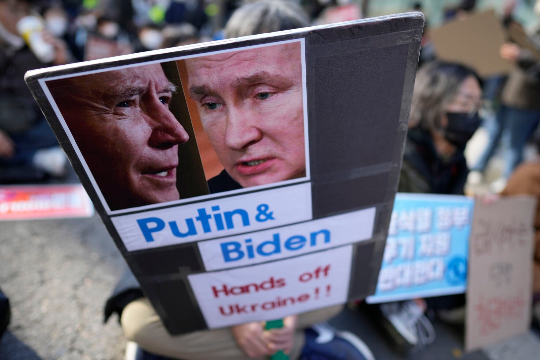 A protester holds a banner showing pictures of U.S. President Joe Biden, left, and Russian President Vladimir Putin during a rally to mark the one-year anniversary of Russia's invasion of Ukraine on Saturday in downtown Seoul, South Korea.