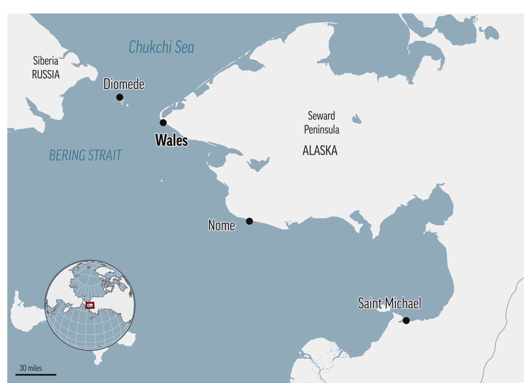 Polar bears appear less frequently in Wales, a community that is the westernmost point on the North American mainland — just 50 miles from Russia across the Bering Strait. Wales is home to about 150 people, almost all of them Inupiat.