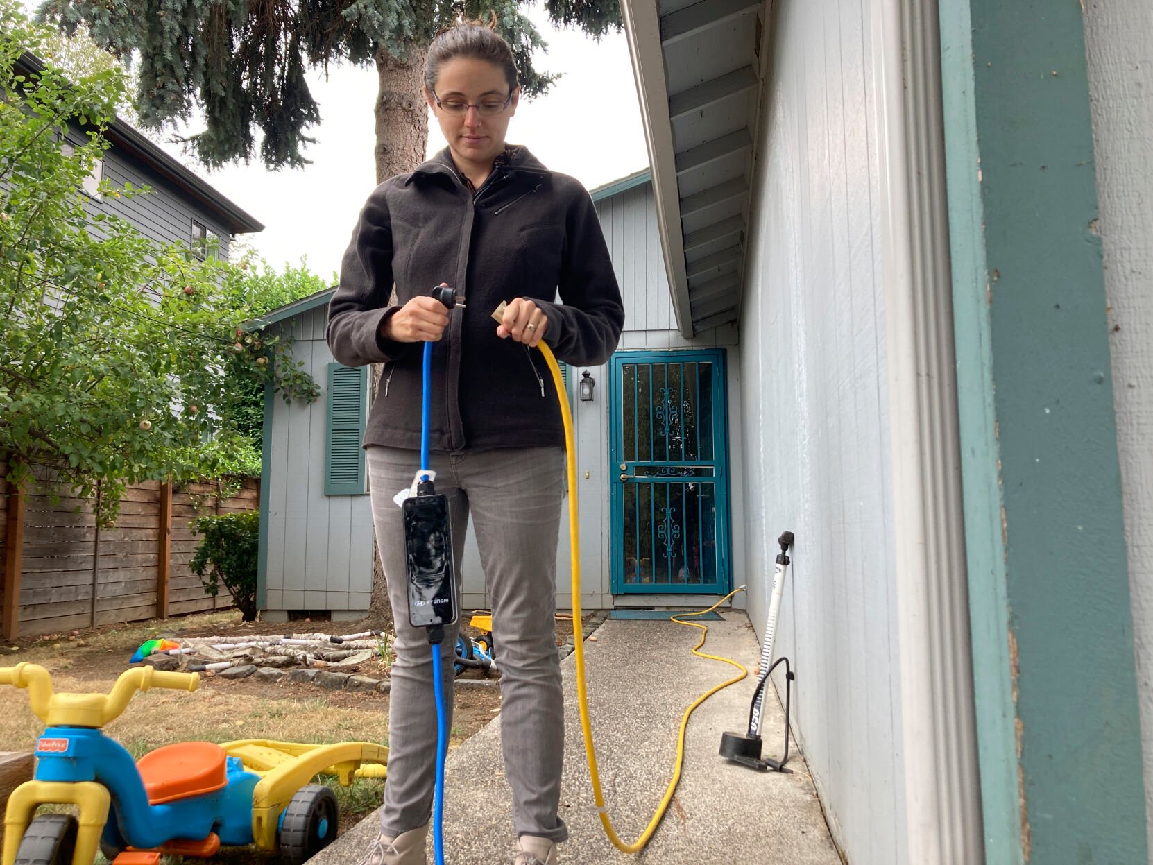 Rebecca DeWhitt shows how she connects an extension cord to her electric vehicle's charging cable outside the Portland, Ore., home she rents on Sept. 30, 2022.