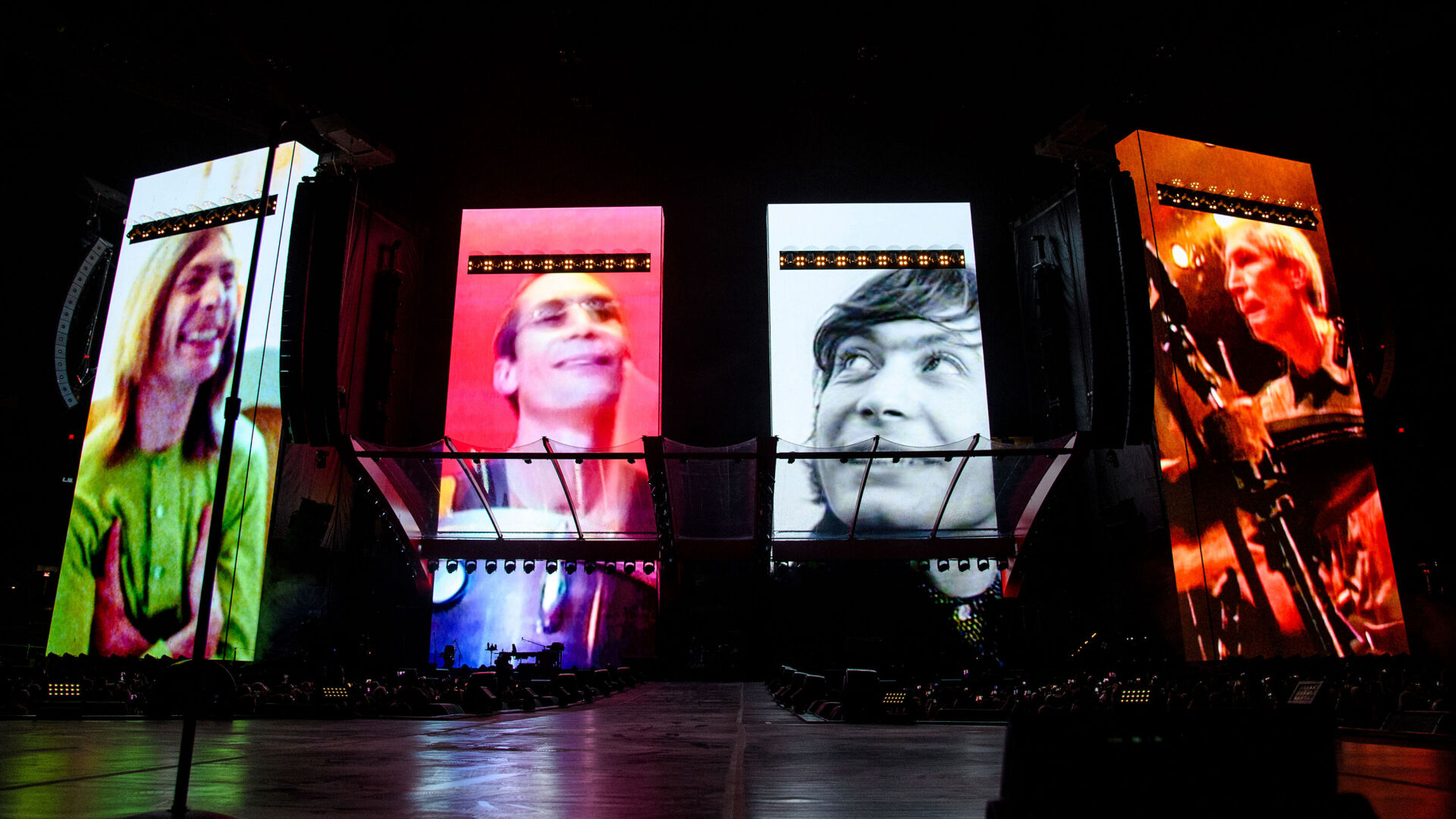 A video tribute to Charlie Watts plays before the Rolling Stones perform in St. Louis, Missouri on Sunday.