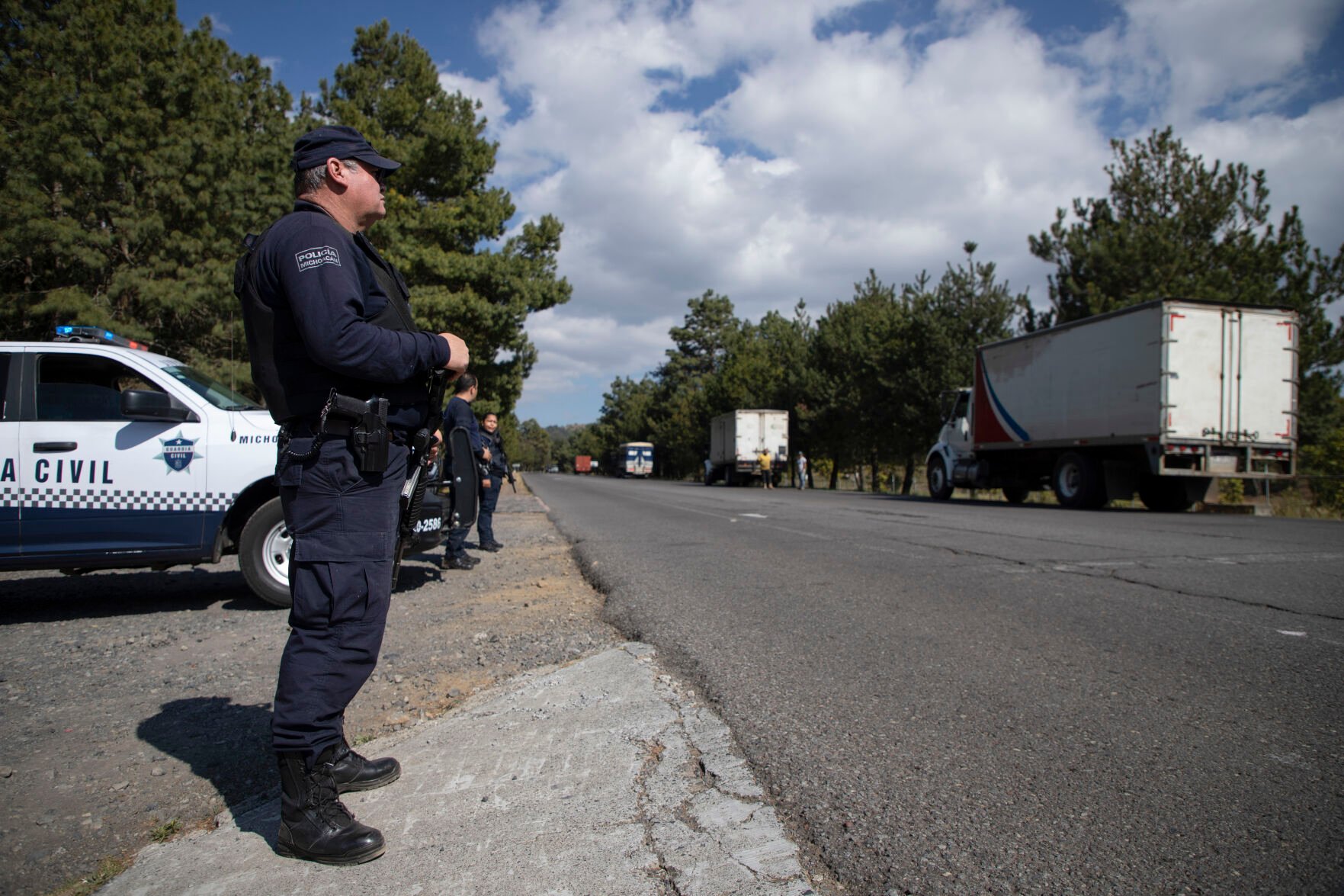 Truck driver Jesús Quintero starts early in the morning, gathering crates of avocados picked the day before in orchards around Santa Ana, before he takes them to a weighing station. Then he joins up with other trucks waiting for a convoy of blue-and-white state police trucks — they recently changed their name to Civil Guard — to start out for Uruapan.