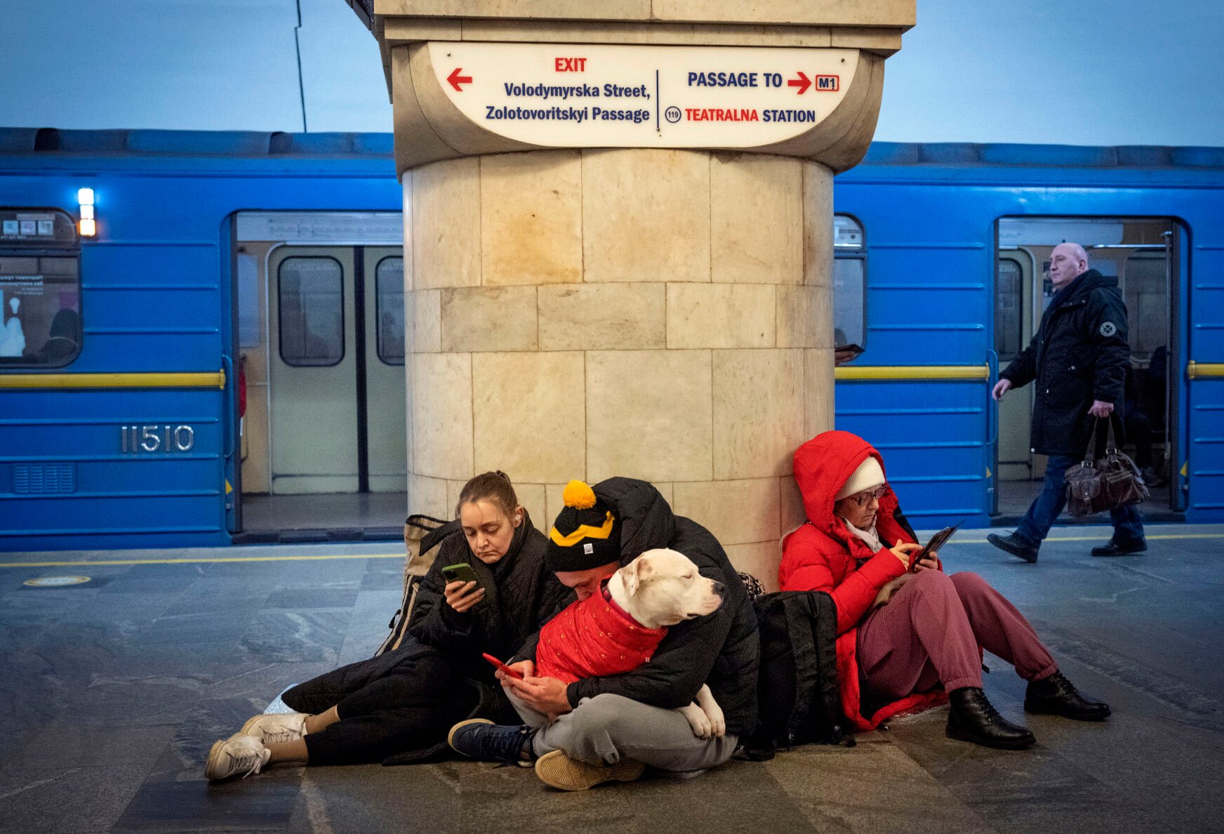 People sit in a subway station being used as a bomb shelter Thursday during a rocket attack in Kyiv, Ukraine.