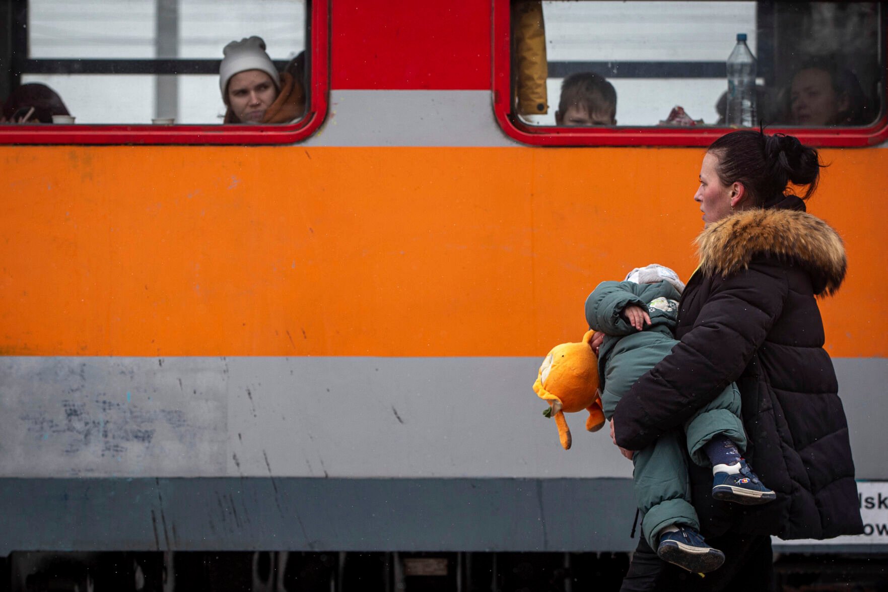 A woman carries her child as she boards a train Wednesday heading for Krakow after fleeing Ukraine, at the border crossing in Medyka, Poland. U.N. officials said that the Russian onslaught has forced 2 million people to flee Ukraine so far.