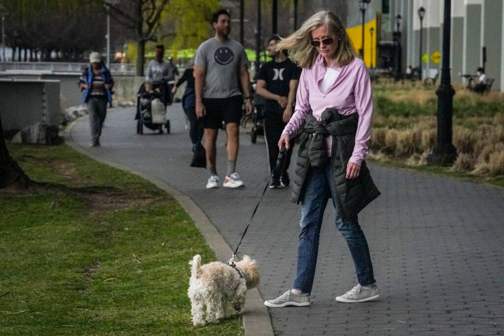 Colleen Briggs and her 8-month-old poodle named Bondi, walk a park near their home, Thursday April 6, 2023, in New York.