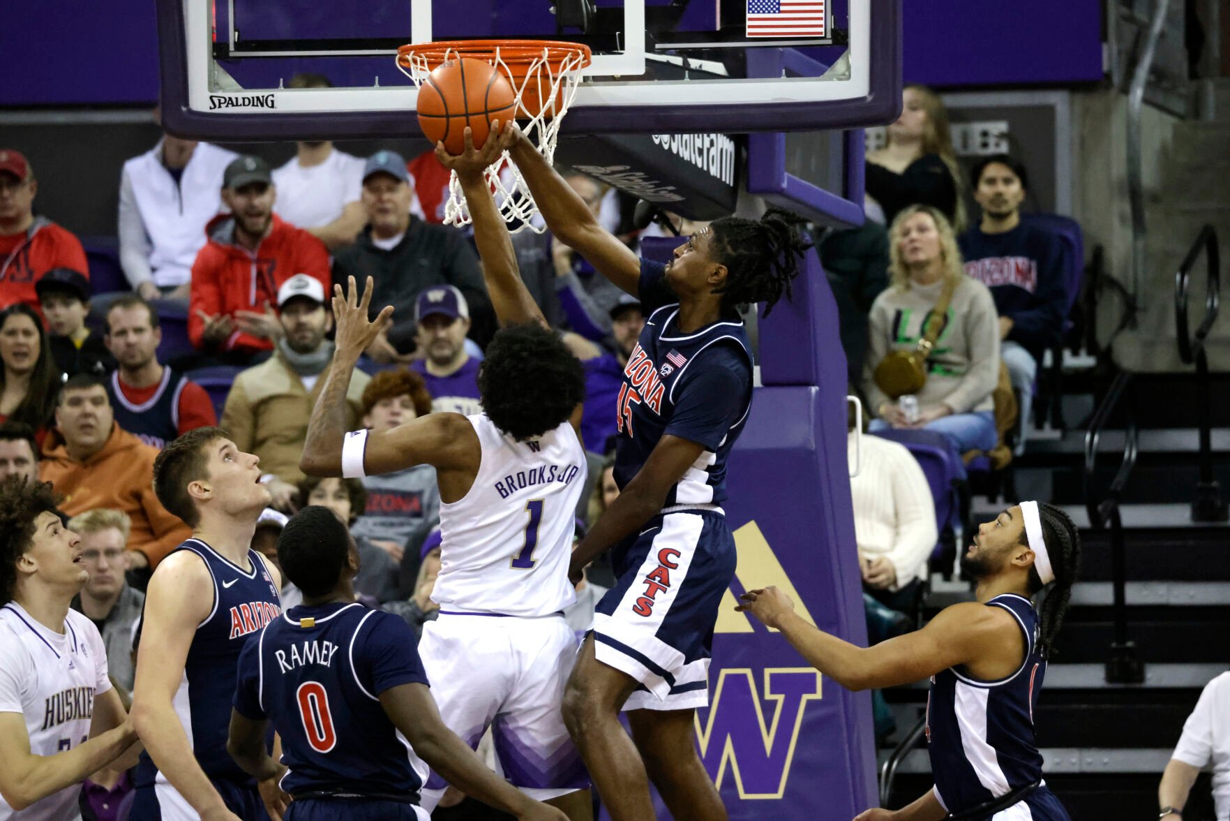 Arizona guard Cedric Henderson Jr., second from right, blocks a shot by Washington forward Keion Brooks (1) during the first half of Saturday's game in Seattle.