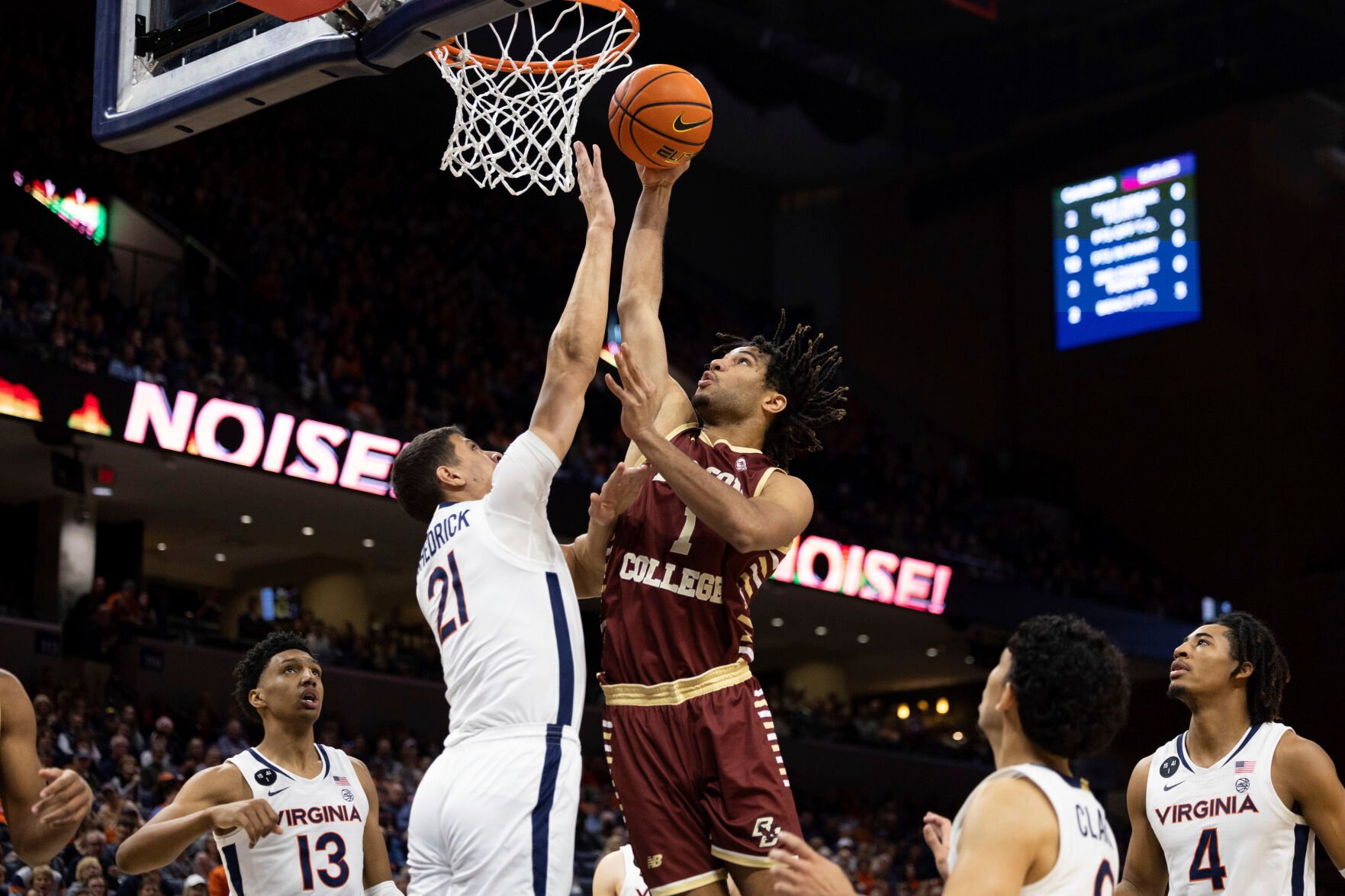 Boston College's T.J. Bickerstaff (1) fights for a basket against Virginia's Kadin Shedrick during the first half of Saturday's game in Charlottesville, Va.