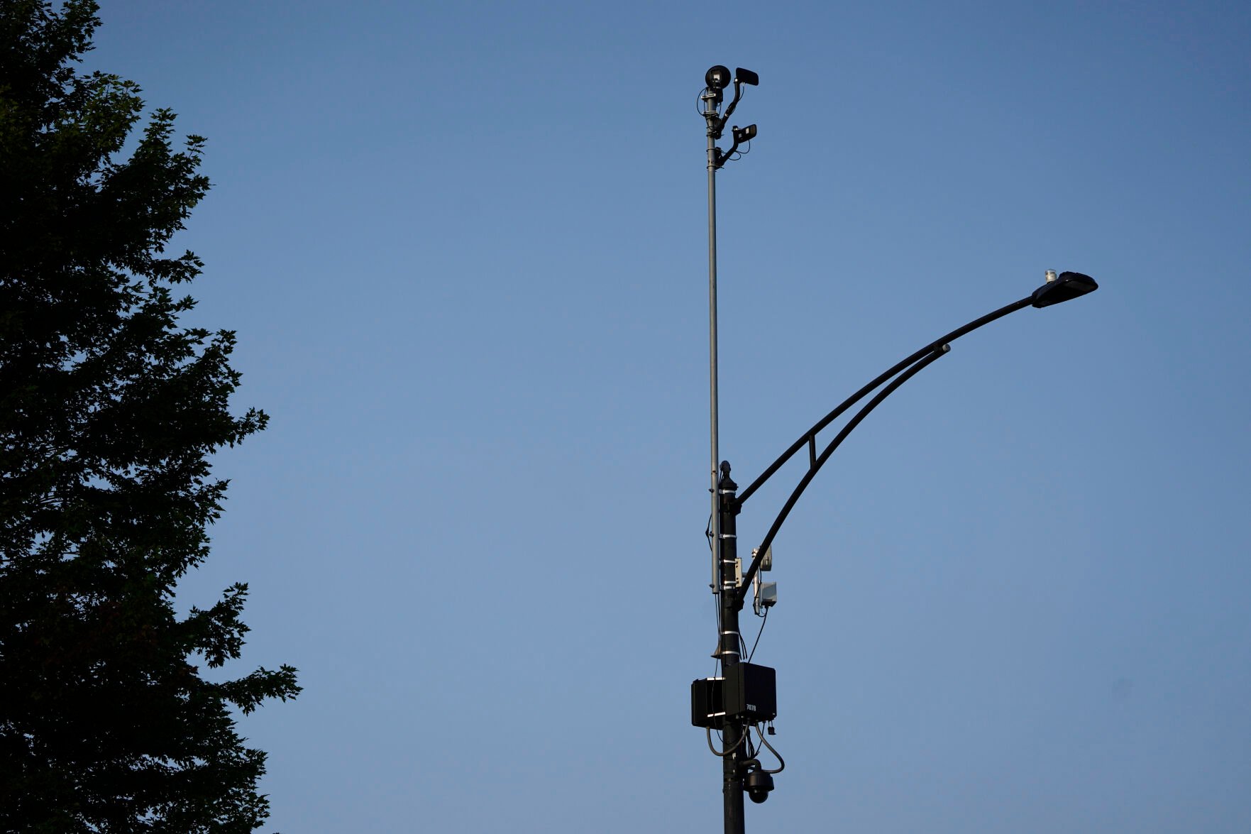 FILE - ShotSpotter equipment overlooks the intersection of South Stony Island Avenue and East 63rd Street in Chicago on Tuesday, Aug. 10, 2021. In more than 140 cities across the United States in 2023, ShotSpotter’s artificial intelligence algorithm and its intricate network of microphones evaluate hundreds of thousands of sounds a year to determine if they are gunfire, generating data now being used in criminal cases nationwide. (AP Photo/Charles Rex Arbogast, File)