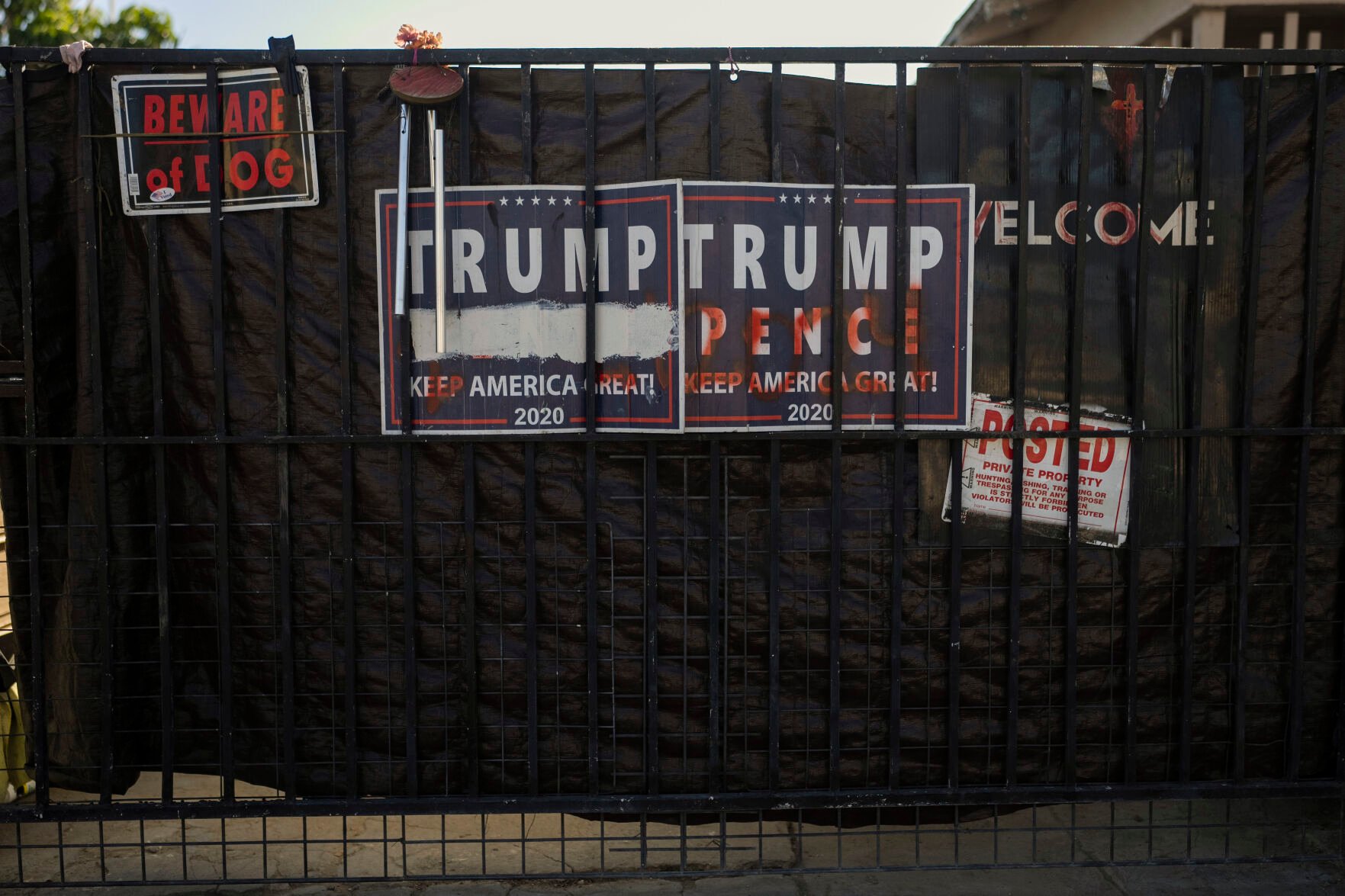 Campaign sigs supporting former President Donald Trump hang on the gate of a home in San Bernardino, Calif., Thursday, Dec. 8, 2022.