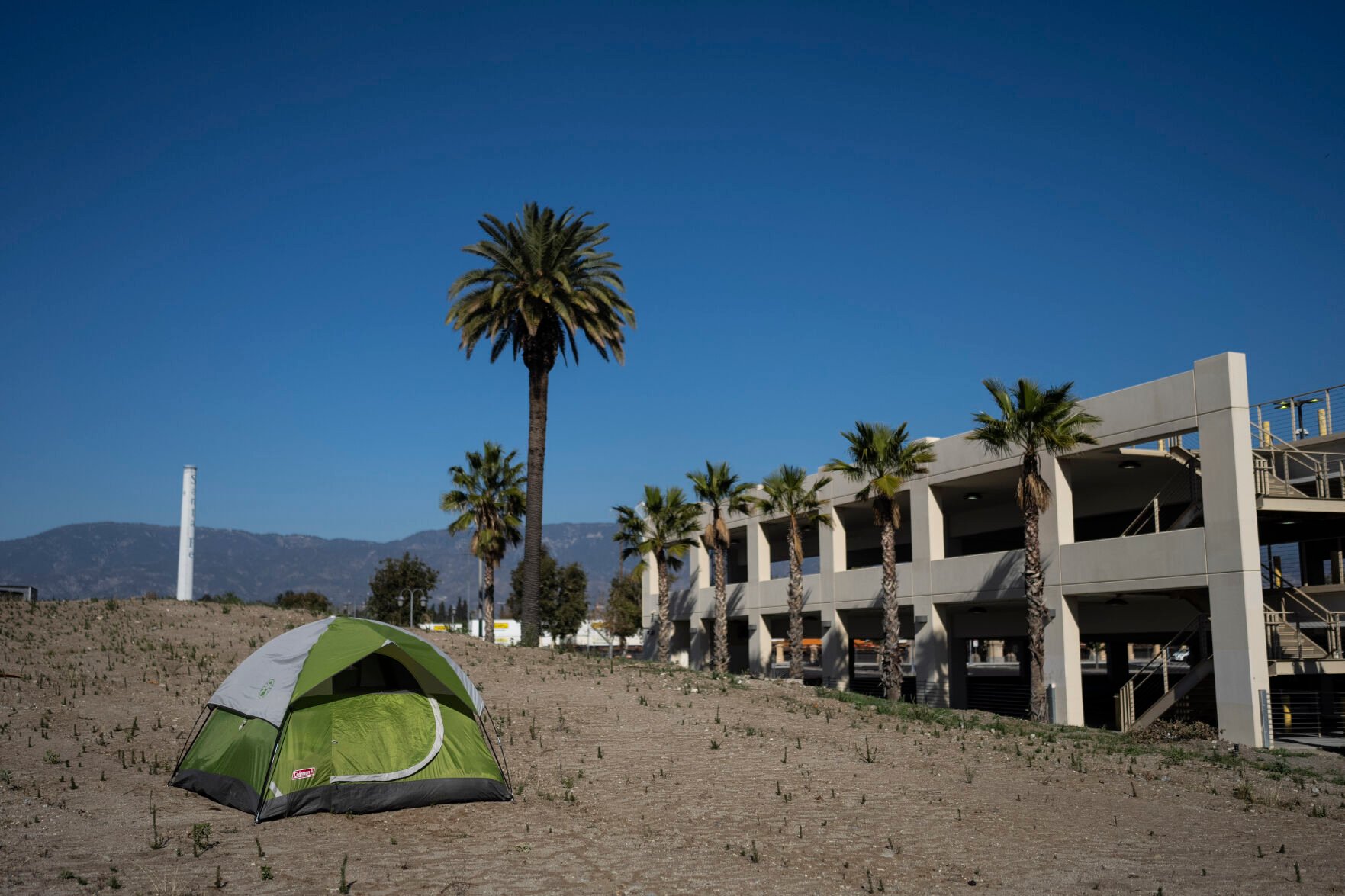 A homeless person's tent sits in an empty lot next to a parking structure in San Bernardino, Calif., Thursday, Dec. 8, 2022.