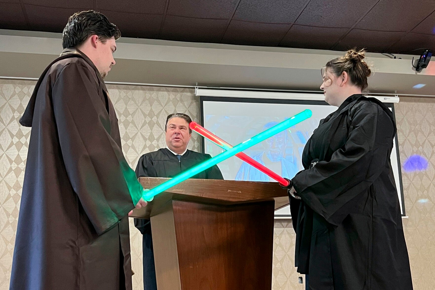 Julia and Robert Jones exchange vows during their "Star Wars"-themed wedding in Akron, Ohio, on May 4.