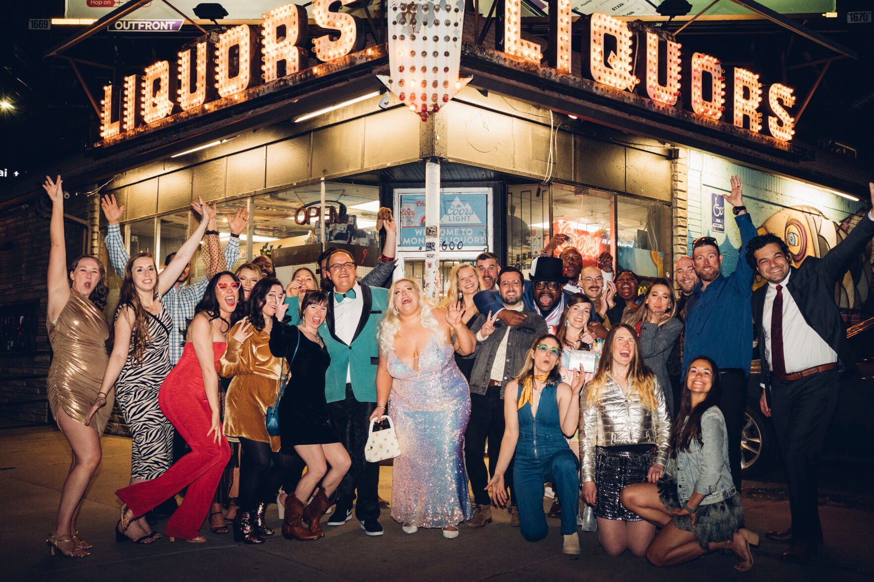 Wedding guest Maggie Long, left, poses with groom Travis Holquin, in green tux, center left, and bride Hannah Holquin, center, at a dive bar-themed wedding in Denver on April 1.