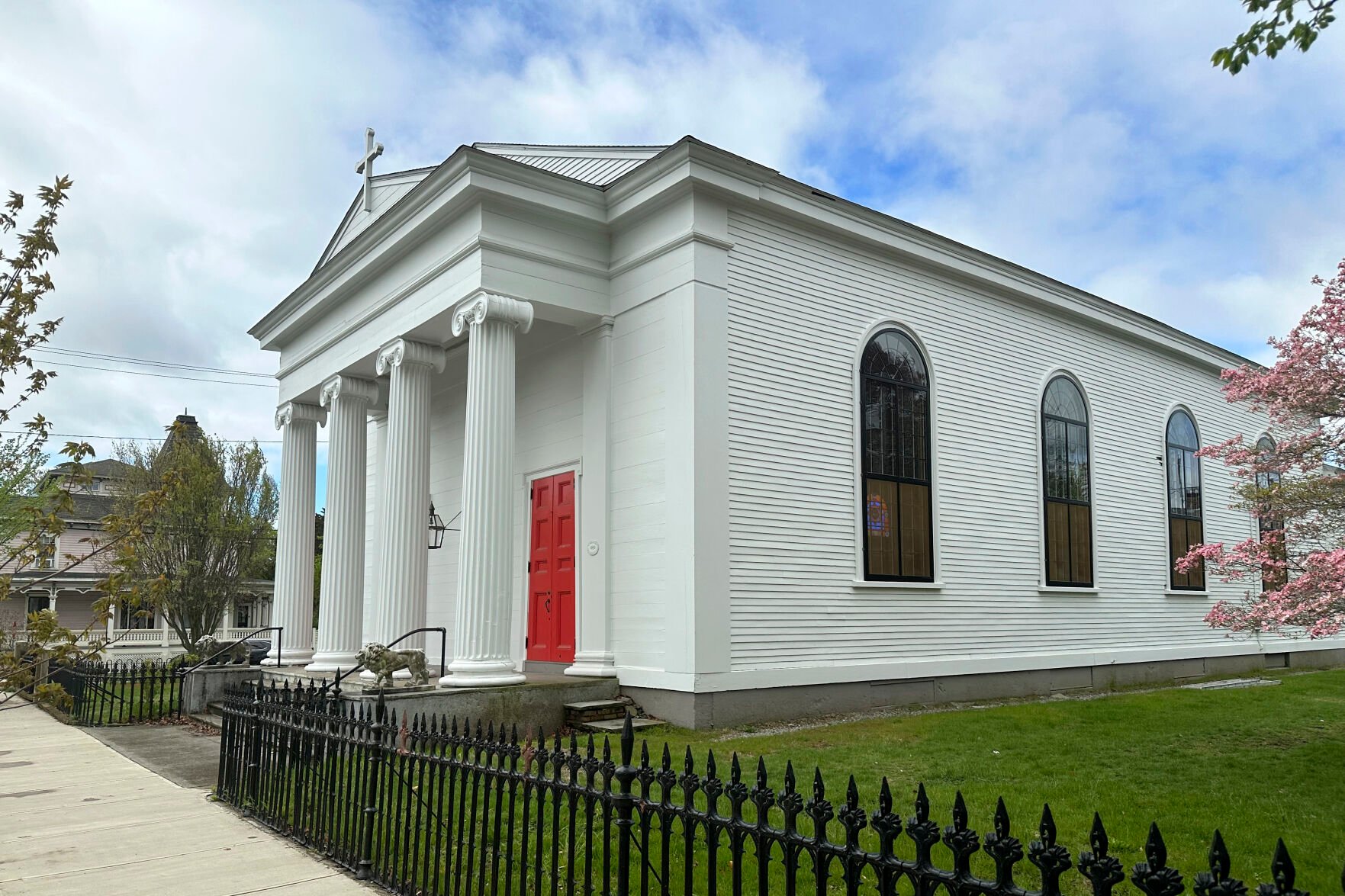 The now-closed St. Mark's Episcopal church rests near grass and an iron fence May 1 in Warren, R.I.
