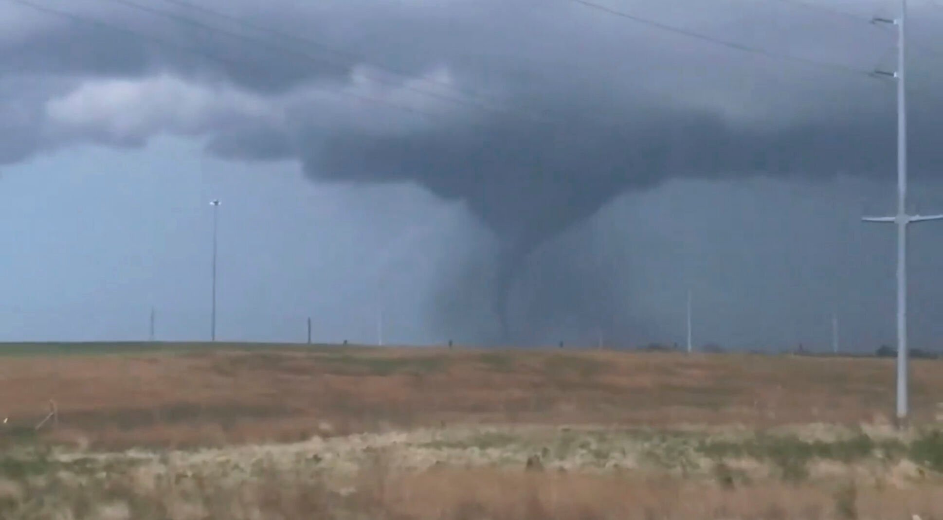 <p>A tornado passes south-central Kansas on Friday, April 29, 2022, southeast Wichita. A suspected tornado that barreled through parts of Kansas damaged multiple buildings, injured several people and left more than 6,500 people without power, officials said Saturday.</p>