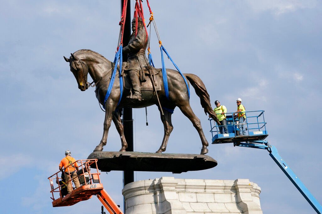 FILE - Crews remove one of the country's largest remaining monuments to the Confederacy, a towering statue of Confederate General Robert E. Lee on Monument Avenue in Richmond, Va., Wednesday, Sept. 8, 2021. The movement to identify and reckon with structural racism moved forward in 2021. As local and state governments grappled with the removal of statues of racist historical figures, local school boards fought over how to teach the uneasy history of racism in the United States.