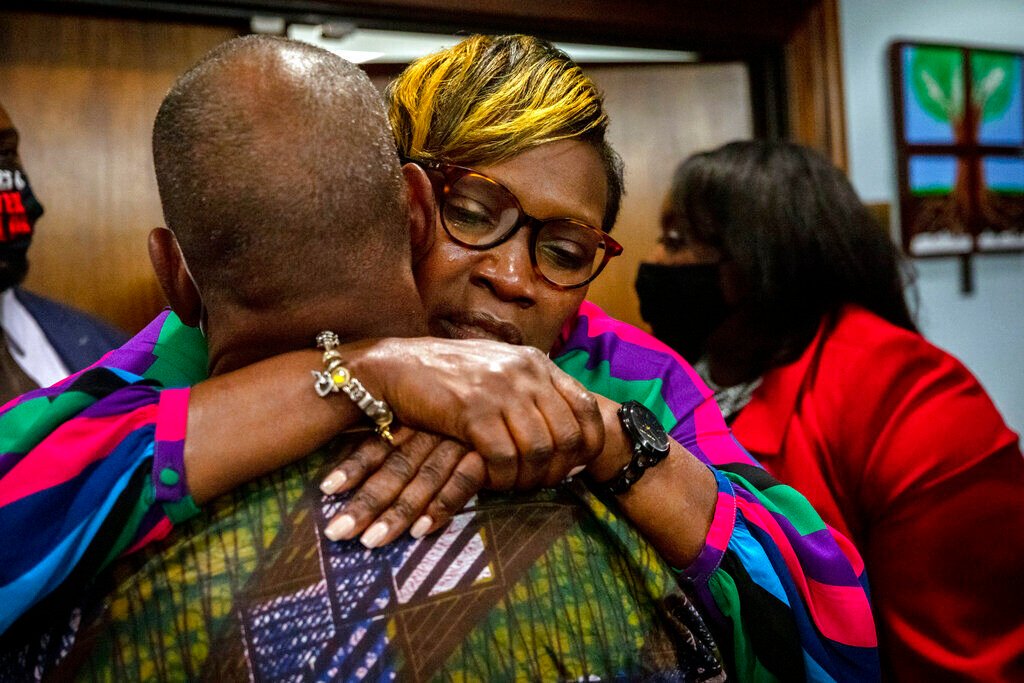FILE - Ahmaud Arbery's mother, Wanda Cooper-Jones his hugged by a supporter after the jury convicted Travis McMichael in the trial of McMichael, his father, Greg McMichael, and neighbor, William "Roddie" Bryan, Wednesday, Nov. 24, 2021, in the Glynn County Courthouse in Brunswick, Ga. The three defendants were found guilty Wednesday in the death of Ahmaud Arbery.