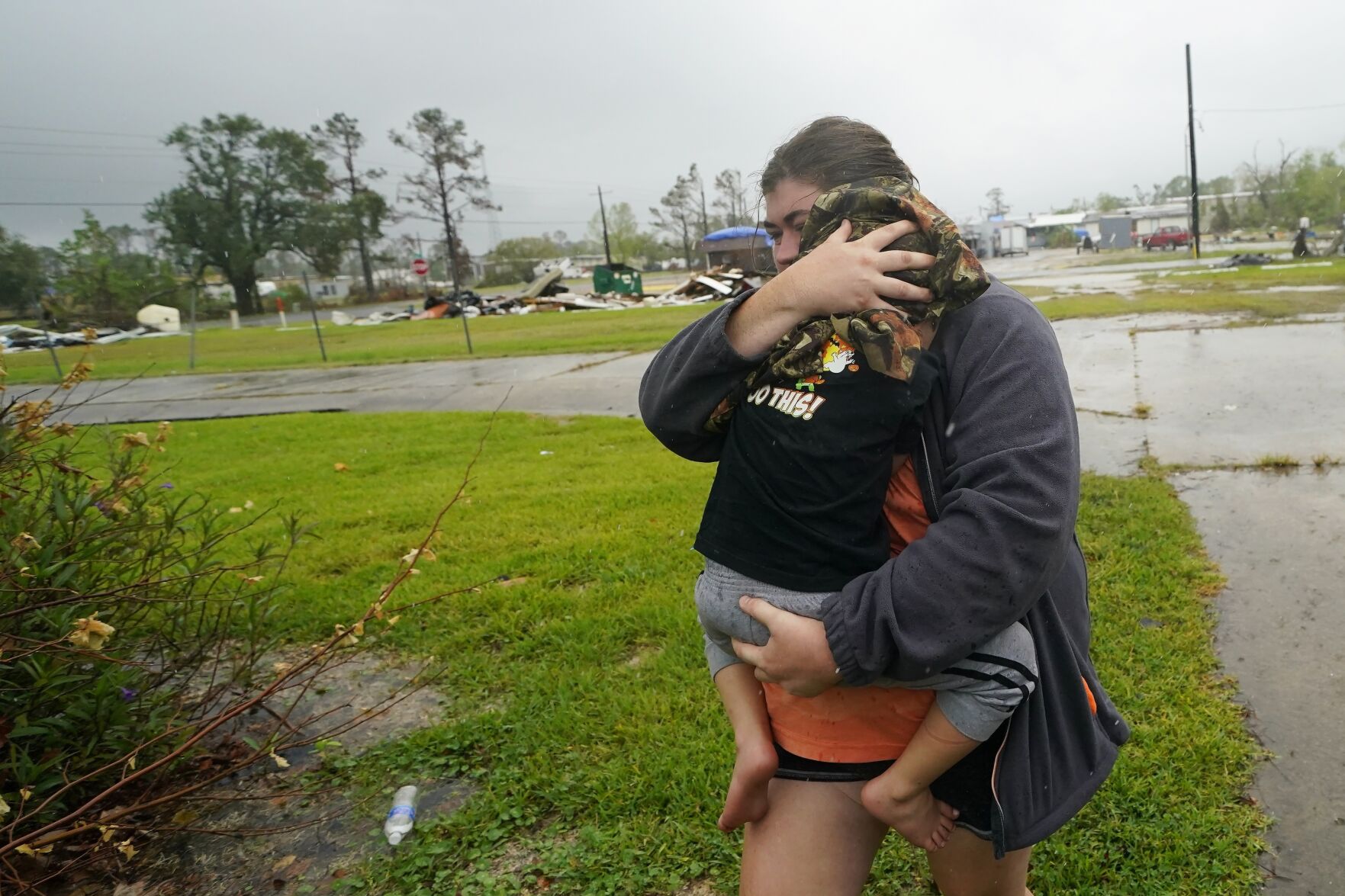 Danielle Fontenot runs to a relative's home in the rain with her son Hunter ahead of Hurricane Delta on Oct. 9, 2020, in Lake Charles, La.