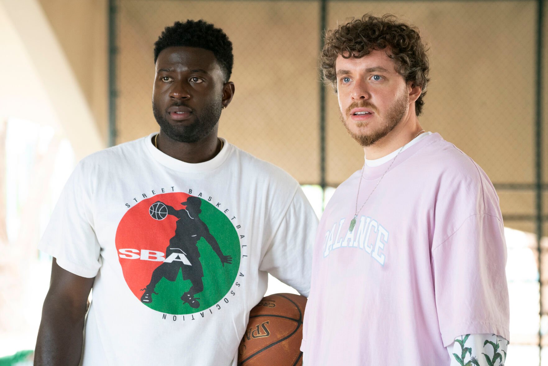 <p>This image released by 20th Century Studios shows Sinqua Walls as Kamal, left, and Jack Harlow as Jeremy in a scene from "White Men Can't Jump." (Peter Lovino/20th Century Studios via AP)</p>