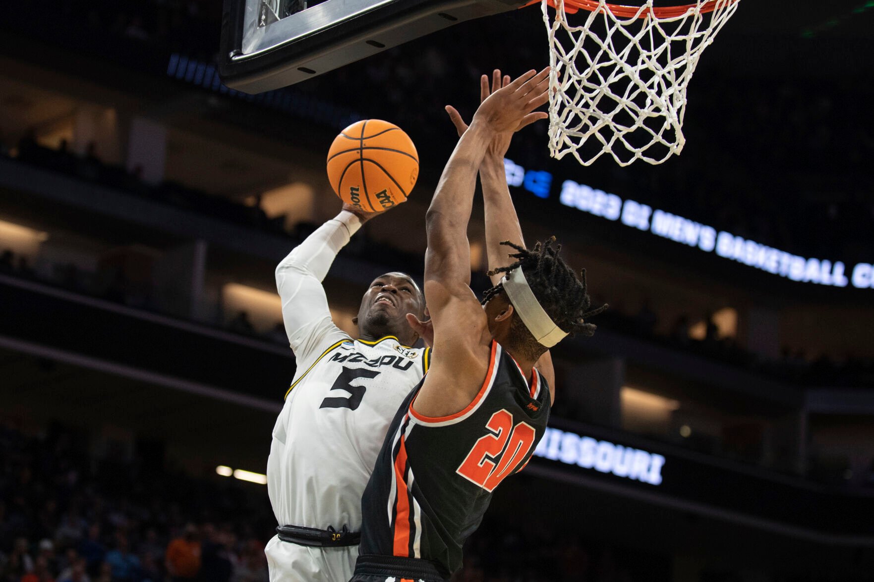 Missouri guard D'Moi Hodge, left, has his shot blocked by Princeton forward Tosan Evbuomwan during a game in the second round of the NCAA Tournament on Saturday in Sacramento, Calif.