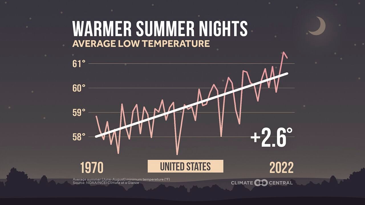 <p>Nationally averaged summer low temperature since 1970 have been climbing.</p>
