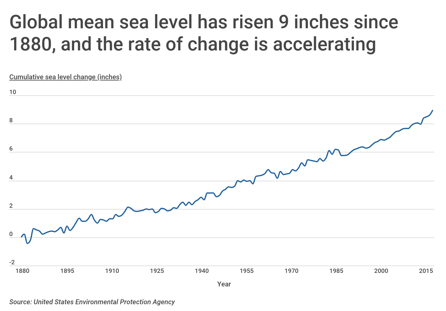 The IPCC’s report projects possible outcomes over the rest of this century, but sea level rise is already an observable occurrence. Data from the U.S. Environmental Protection Agency shows that global mean sea level has risen nearly 9 inches since 1880, and the rate of increase has accelerated over time. Beginning in 1880, it took nearly 20 years for sea level to rise by one inch. More recently, the mean sea level rose by one inch just from 2010 to 2015.