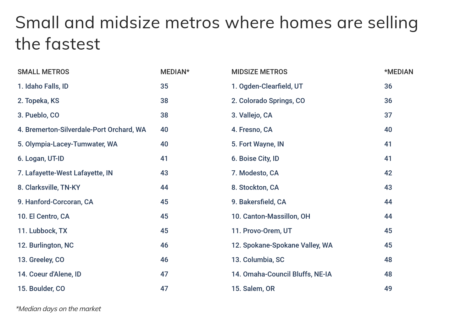 The data used in this analysis is from Realtor.com’s Real Estate Data: Inventory-Monthly and the U.S. Census Bureau’s 2019 American Community Survey. To determine the locations where homes are selling fastest, researchers calculated the median number of days property listings were on the market in 2020. Time spent on the market is defined as the time between the initial listing of a property and either its closing date or the date it is taken off the market. A lower number of days on the market corresponds to homes selling faster. In the event of a tie, the location with the greatest decrease in median days on the market was ranked higher. All real estate data shown is for 2020, and was calculated by averaging the monthly values for January–December of 2020. Only single-family homes, condos, and townhomes were included in the analysis.