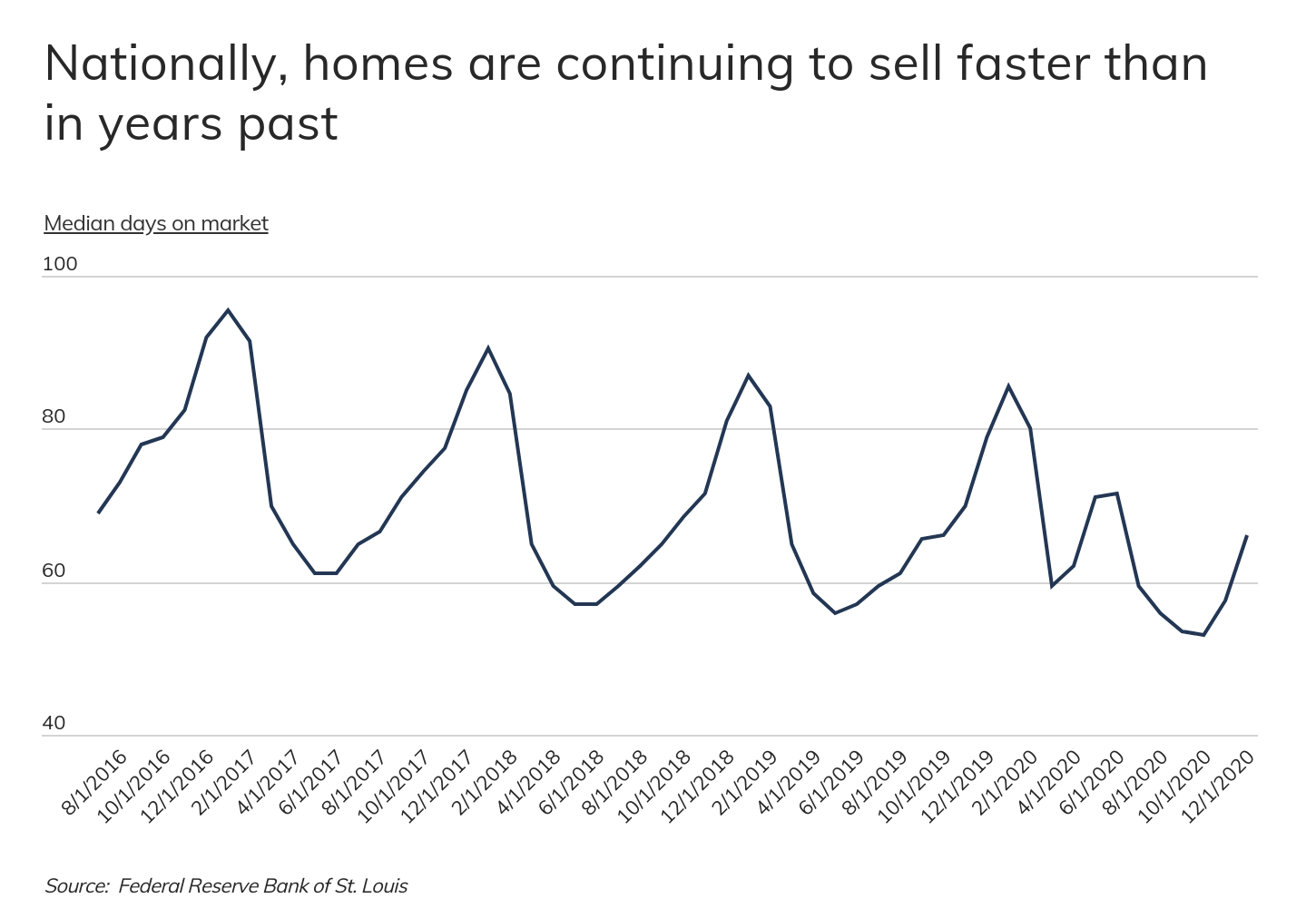 Limited supply has affected sales in two major ways: first, prices are much higher, and second, homes are flying off the market. As with inventory, time to close usually follows seasonal patterns, with sales taking longer in the winter and less time in the warmer months. And here again, COVID-19 had a strong impact: sales were unusually slow after stay-at-home orders took effect but accelerated again over the course of the year. The median number of days a home spent on the market in the last quarter of 2020 was more than 15 percent lower year-over-year than the same period in 2019.