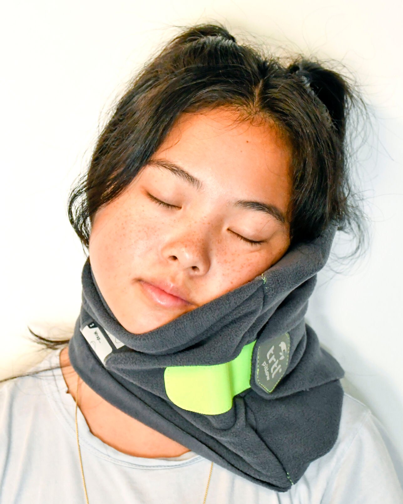 Unlike U-shaped pillows, this one looks like a scarf or bandanna and relies on internal support (an adjustable plastic brace and Velcro strip) to keep your head supported while you nap. You will need to decide between leaning right or left. It’s thinner and lighter (5.2 ounces) than most travel pillows, and, simply put, it doesn’t look so dorky. Once aboard, “loop, wrap & nap” (Trtl’s slogan). Droolers, don’t fret — it’s machine washable.