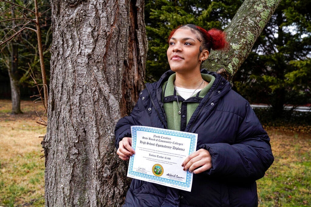 Kailani Taylor-Cribb holds her GED diploma outside her home in Asheville, N.C., on Tuesday, Jan. 31, 2023.