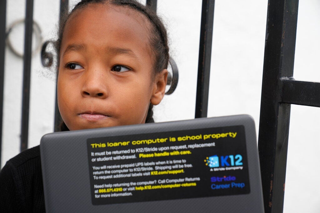 Ezekiel West, 10, opens up his K12/Stride school loaner laptop computer outside his home in Los Angeles on Sunday, Jan. 15, 2023. In January, Ezekiel began studying in a public online school for California students, but his mother and attorney are concerned the program isn't flexible enough for Ezekiel, who is years behind in reading.