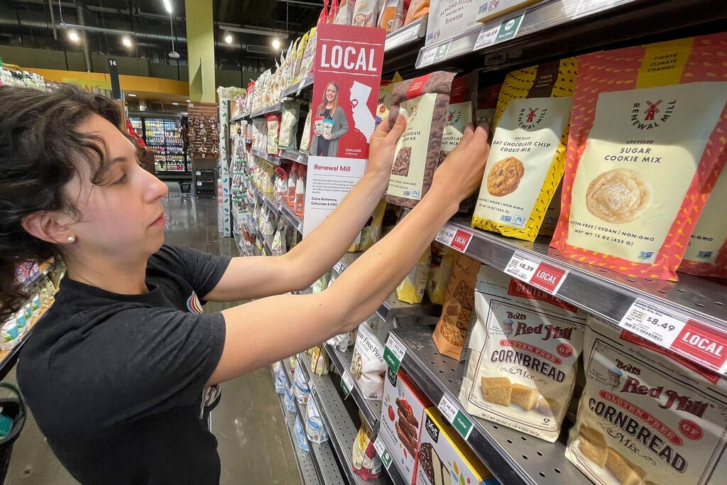 Caroline Cotto, co-founder of Renewal Mill, adjusts her company's upcycled food products on a shelf inside a Whole Foods store in Oakland, Calif., on June 7.