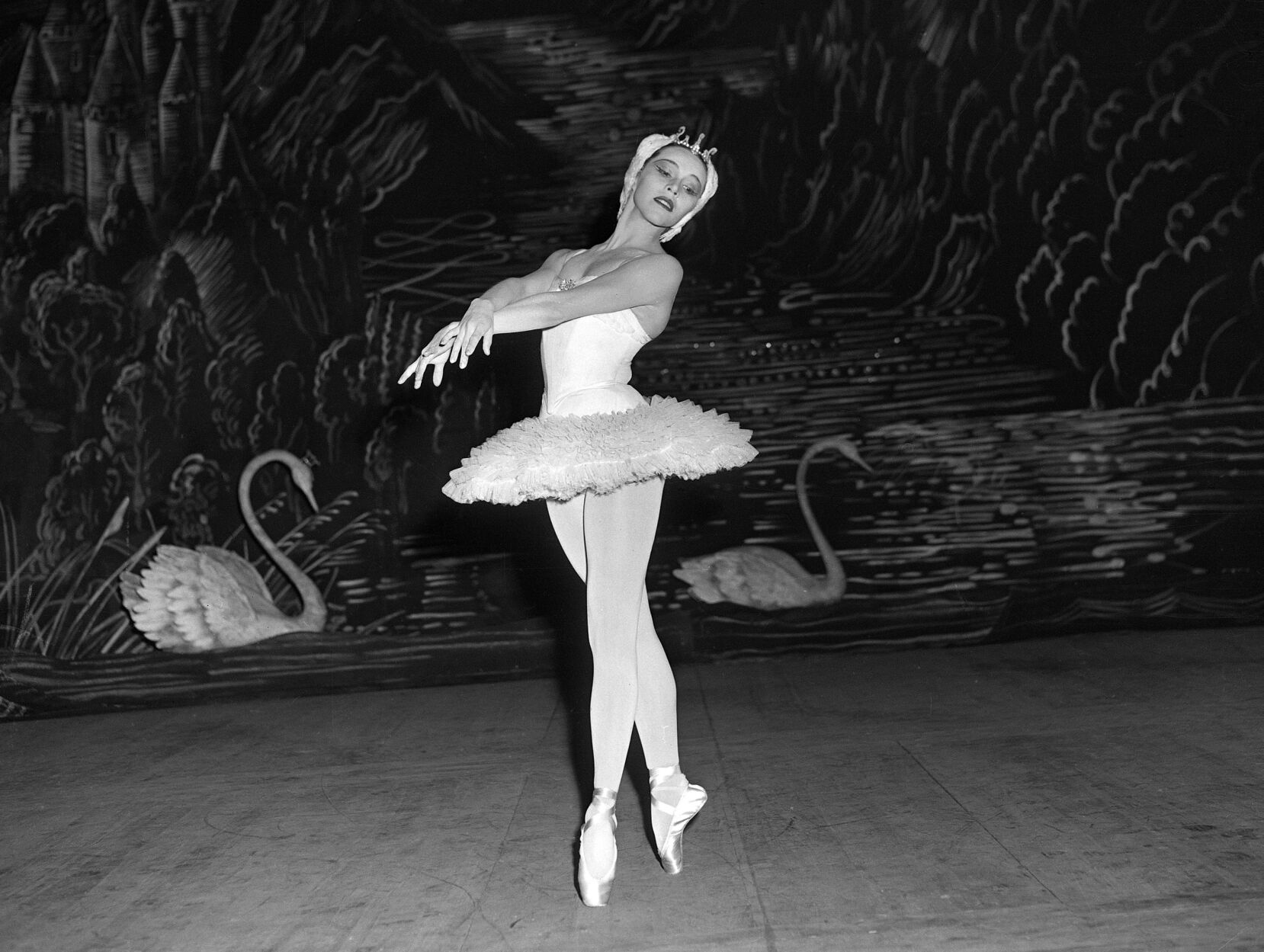 FILE - This Sept. 14, 1953 file photo shows Maria Tallchief, prima ballerina of the New York City Ballet, in Tschaikowsky's "Swan Lake" during the opening performance of the company's engagement at the Scala Theater in Milan, Italy.