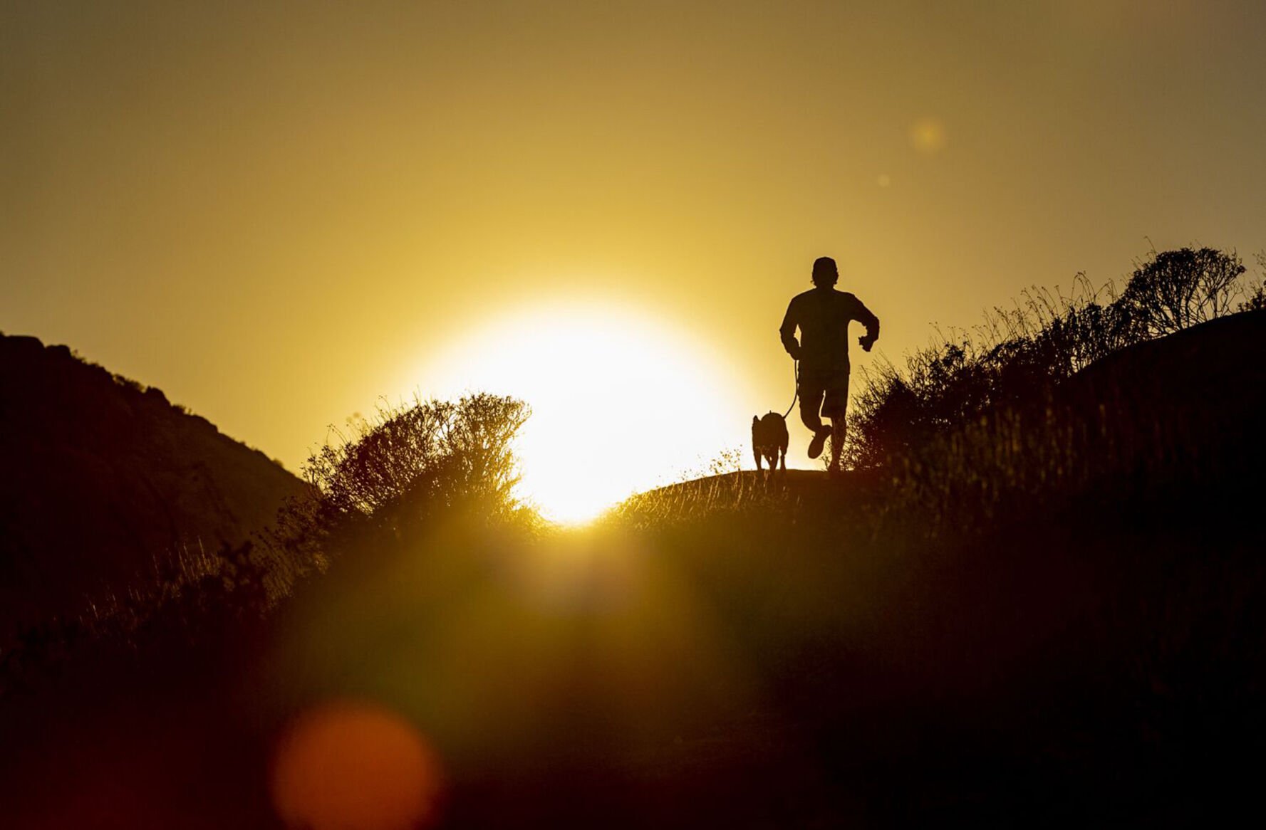 With temperatures reaching triple-digits on Sept. 27, 2022, a resident takes advantage of the 90-degree temperatures at dusk to get in a jog with his dog at a park in Riverside, California.