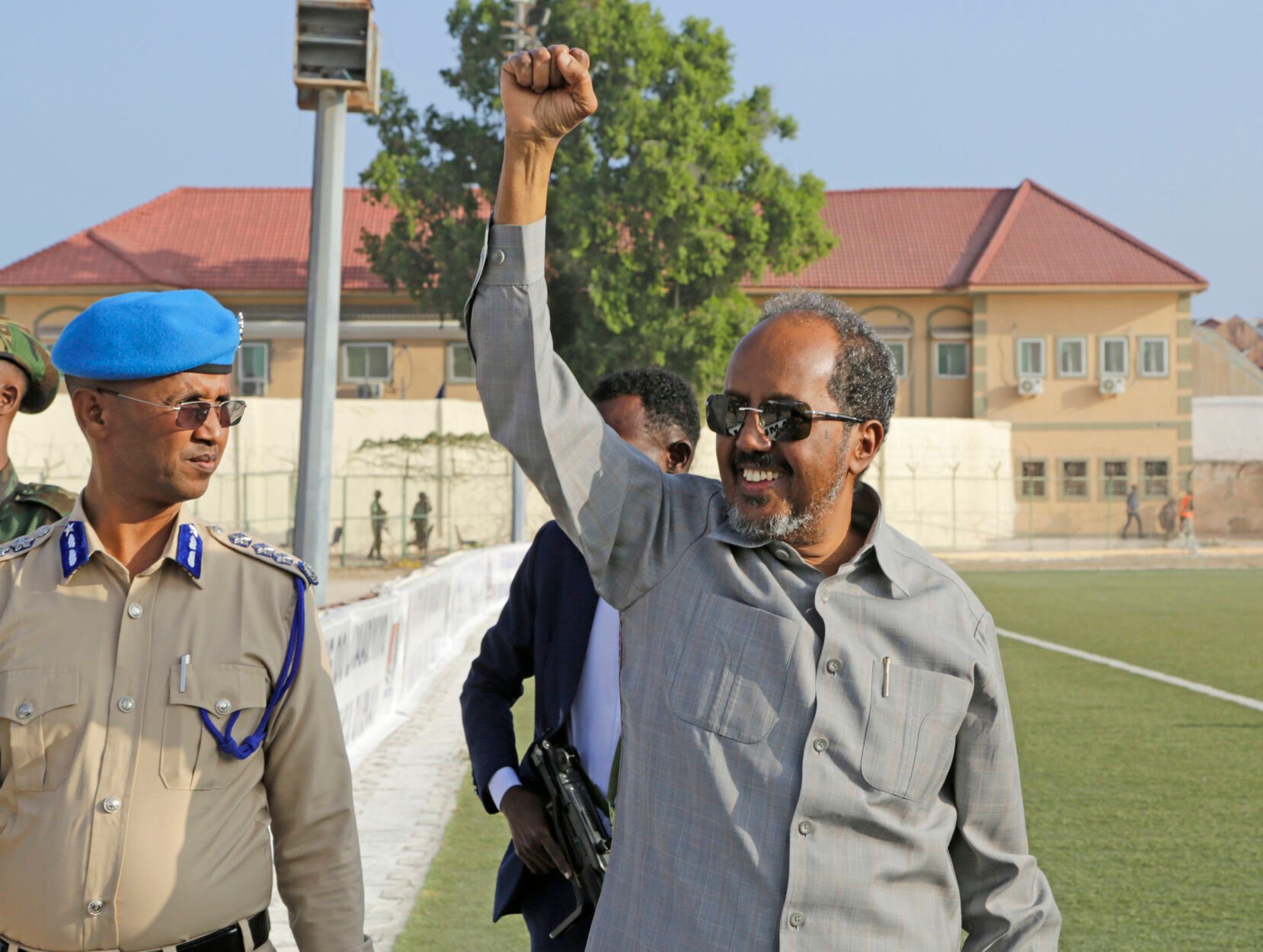 Somalia President Hassan Sheikh Mohamud leads a demonstration Jan. 12 at Banadir stadium in Mogadishu.