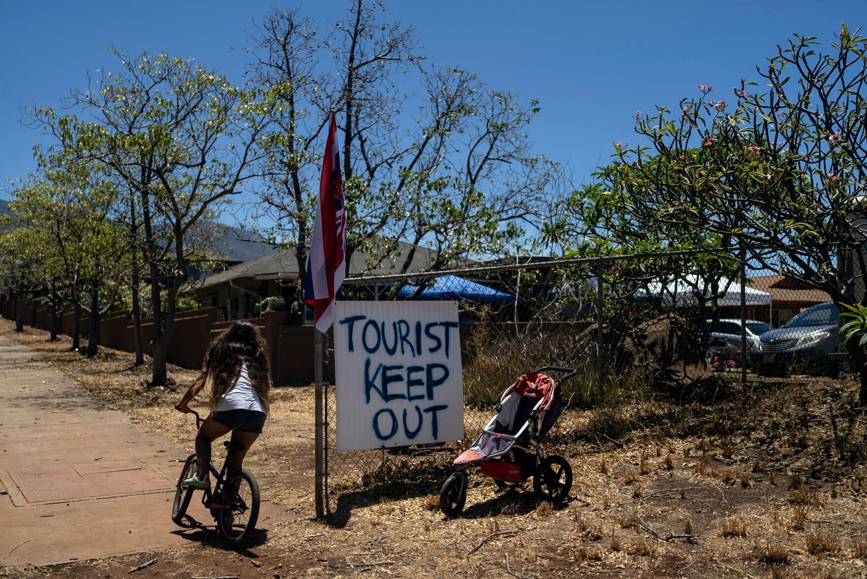 FILE - A girl rides her bike past a sign that says "Tourist Keep Out," in Lahaina, Hawaii, Thursday, Aug. 17, 2023. Nearly a month after the deadliest U.S. wildfire in more than a century killed scores of people, authorities on Maui are working their way through a list of the missing that has grown almost as quickly as names have been removed. Lawsuits are piling up in court over liability for the inferno, and businesses across the island are fretting about what the loss of tourism will mean for their futures. (AP Photo/Jae C. Hong, File)