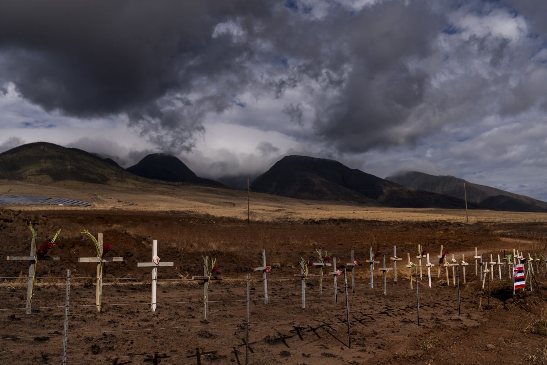 FILE - Crosses honoring victims killed in a recent wildfire are posted along the Lahaina Bypass in Lahaina, Hawaii, Aug. 21, 2023. Nearly a month after the deadliest U.S. wildfire in more than a century killed scores of people, authorities on Maui are working their way through a list of the missing that has grown almost as quickly as names have been removed. Lawsuits are piling up in court over liability for the inferno, and businesses across the island are fretting about what the loss of tourism will mean for their futures. (AP Photo/Jae C. Hong, File)