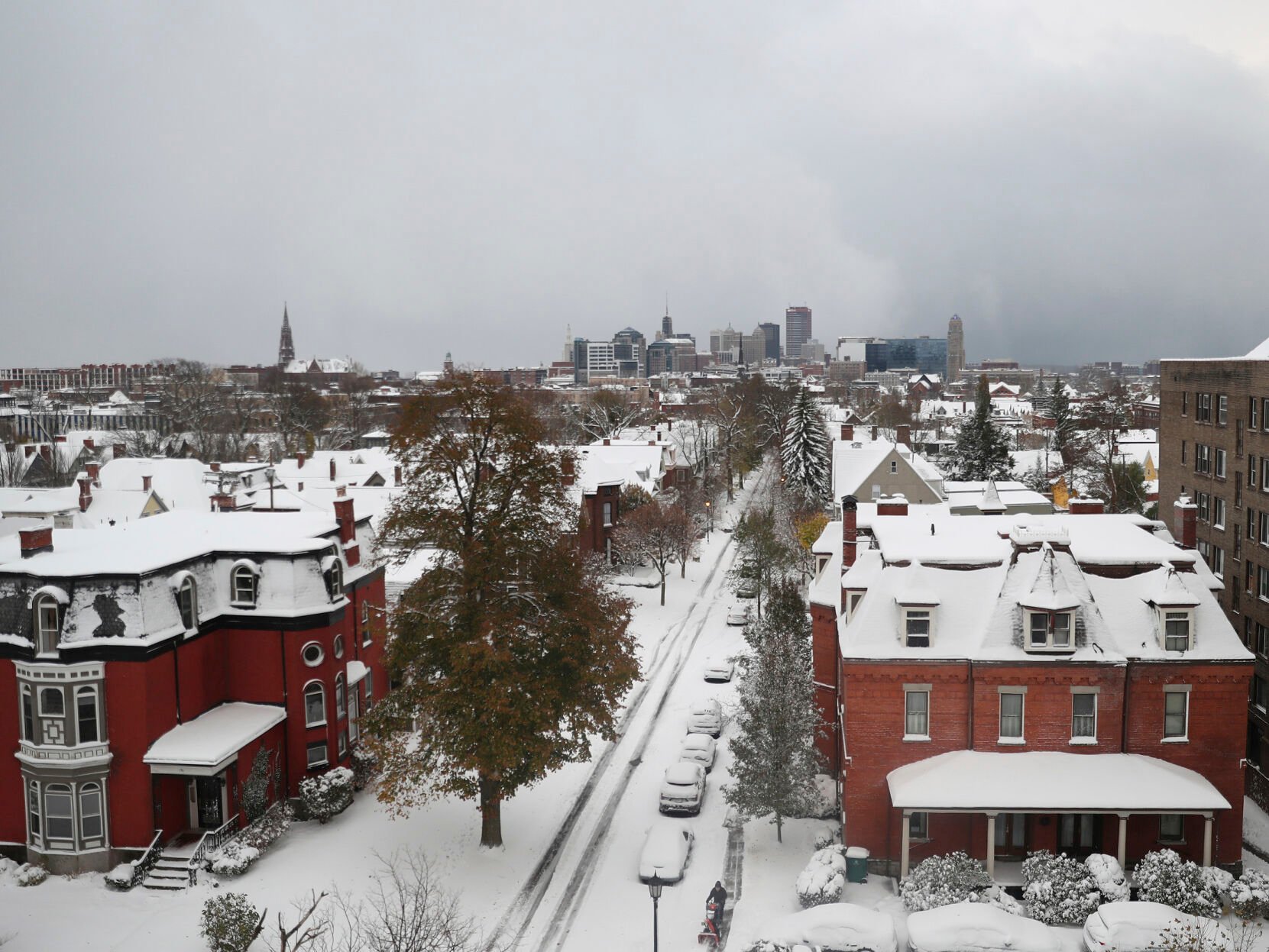 Homes and parked cars sit under a blanket of snow, Friday, Nov. 18, 2022, in Buffalo, N.Y. A dangerous lake-effect snowstorm paralyzed parts of western and northern New York on Friday.