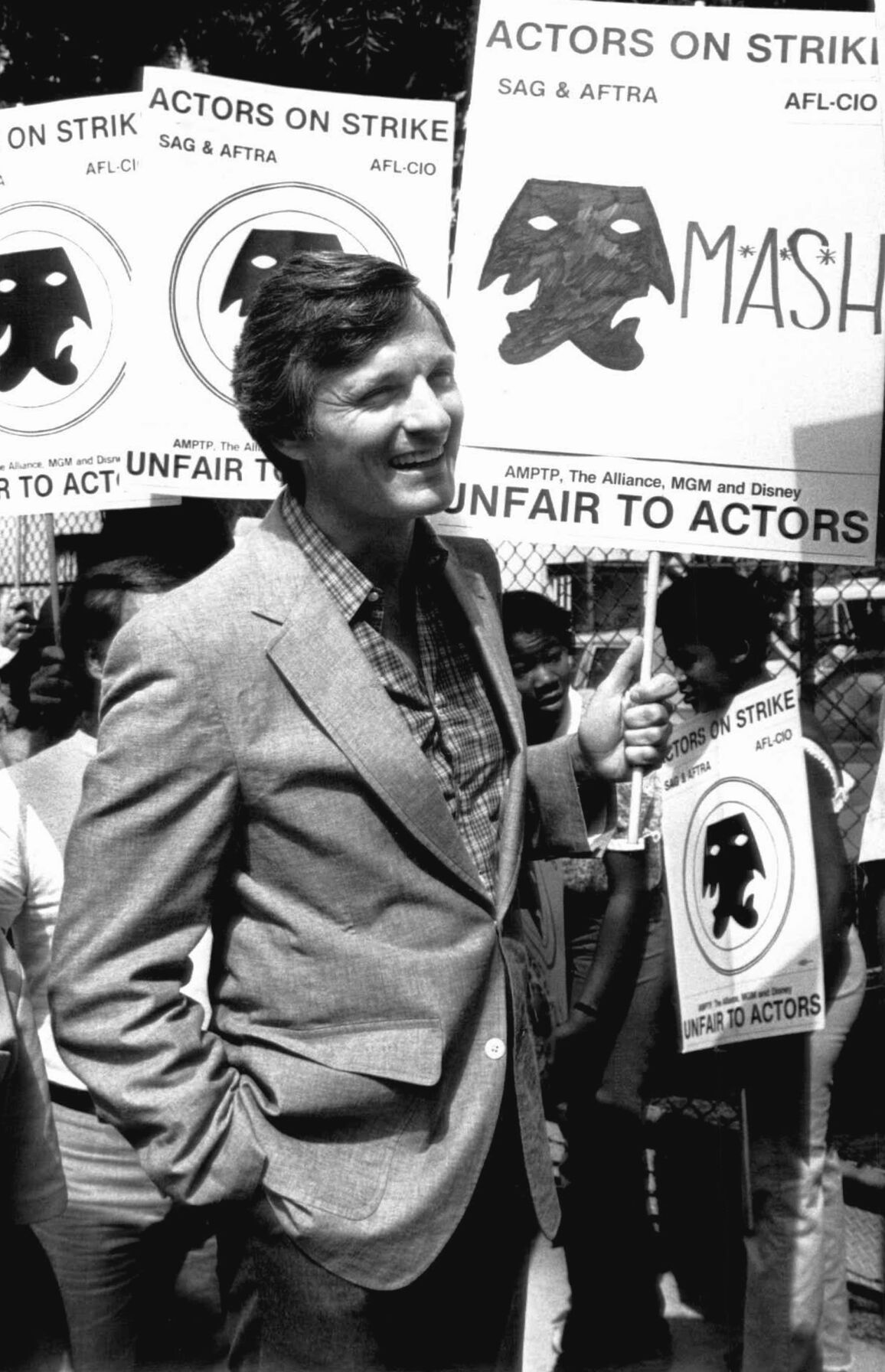 FILE - Actor Alan Alda, from the series "M*A*S*H*," pickets Twentieth-Century Fox studios in Los Angeles, Aug. 6, 1980. Alda said the actors who have been successful owe it to other actors to join the strike for fair wages. (AP Photo/Randy Rasmussen)